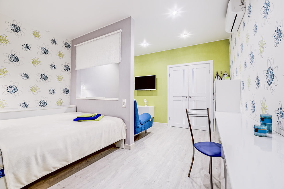 Pangsapuri studio dengan katil di bawah siling akan meluahkan keperibadian anda. Sesuatu kecil di dinding akan menyediakan katil tambahan.