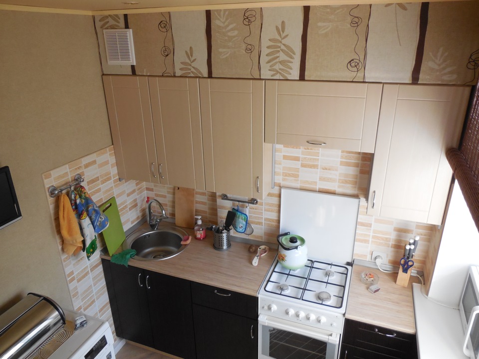 Interior dapur di Khrushchev dengan unsur-unsur gaya klasik