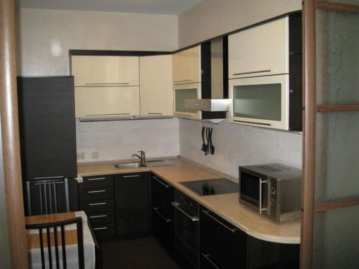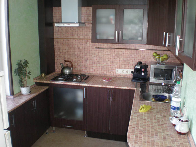 - Jika boleh dan perlu, anda boleh mengubah reka bentuk bilik. Untuk melakukan ini, gunakan balkoni atau loggia untuk meningkatkan rakaman atau untuk mencapai bentuk dapur yang berlainan.