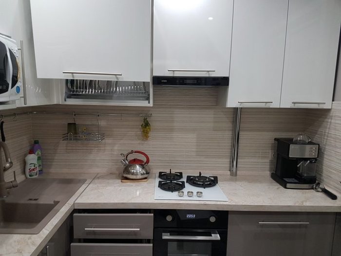 Dalam dapur gaya minimalis, semuanya tersembunyi di dalam kabinet, jadi perintah sempurna selalu berkuasa di sini