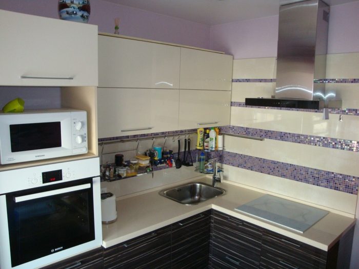 Pereka menegaskan modul monochrome mencerminkan. Tetapi pada masa yang sama mereka membenarkan sejenis apron atau aksen lain, menekankan berteknologi tinggi. Lagipun, adalah salah untuk mengakui kekaburan stylistics dalam ruang dengan ciri-ciri persegi.