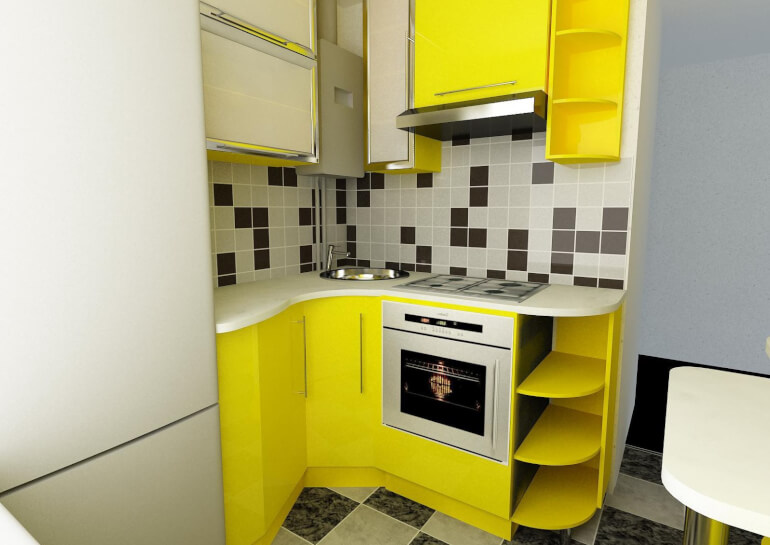 Kawasan kerja di dapur kecil sebaiknya memenuhi prinsip yang sama dengan trajektori yang selesa seperti dalam keadaan lain. Lagipun, proses memasak tidak berubah dari ini. Lebih baik pemilik boleh bergerak dalam corak segi tiga.
