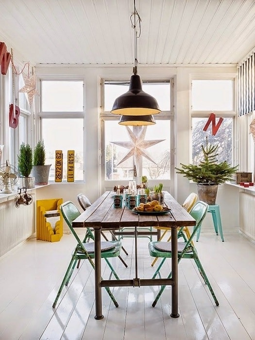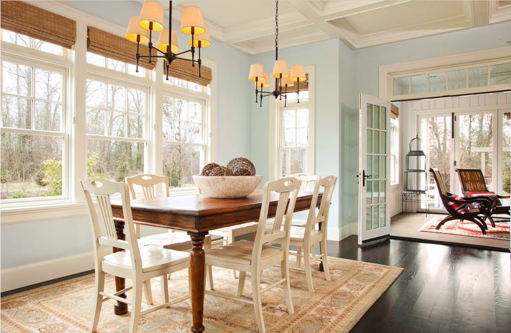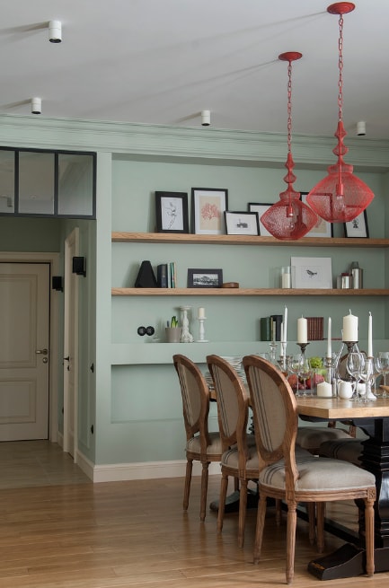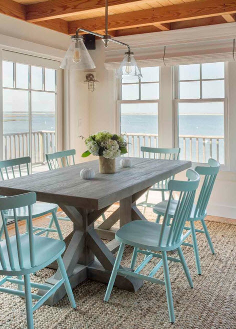 Tambahkan warna pudar ke ruang makan. Beli meja dan kerusi semestinya kayu. Tentukan terlebih dahulu warna pudina. Dalam warna ini dan dapatkan perabot.