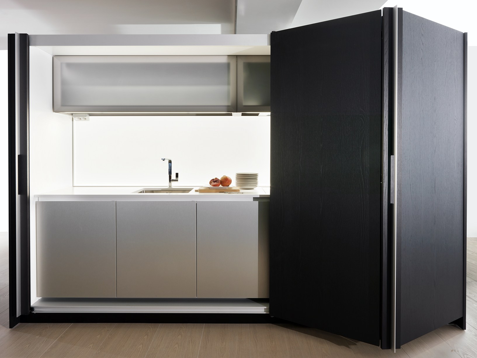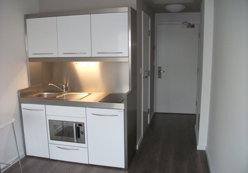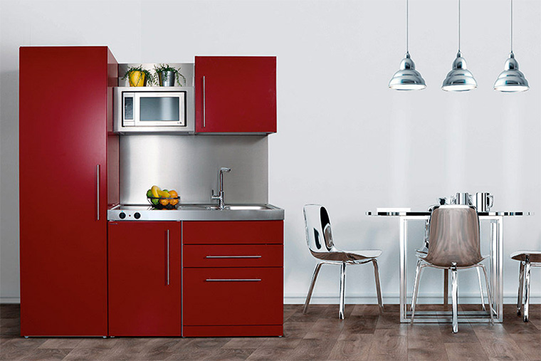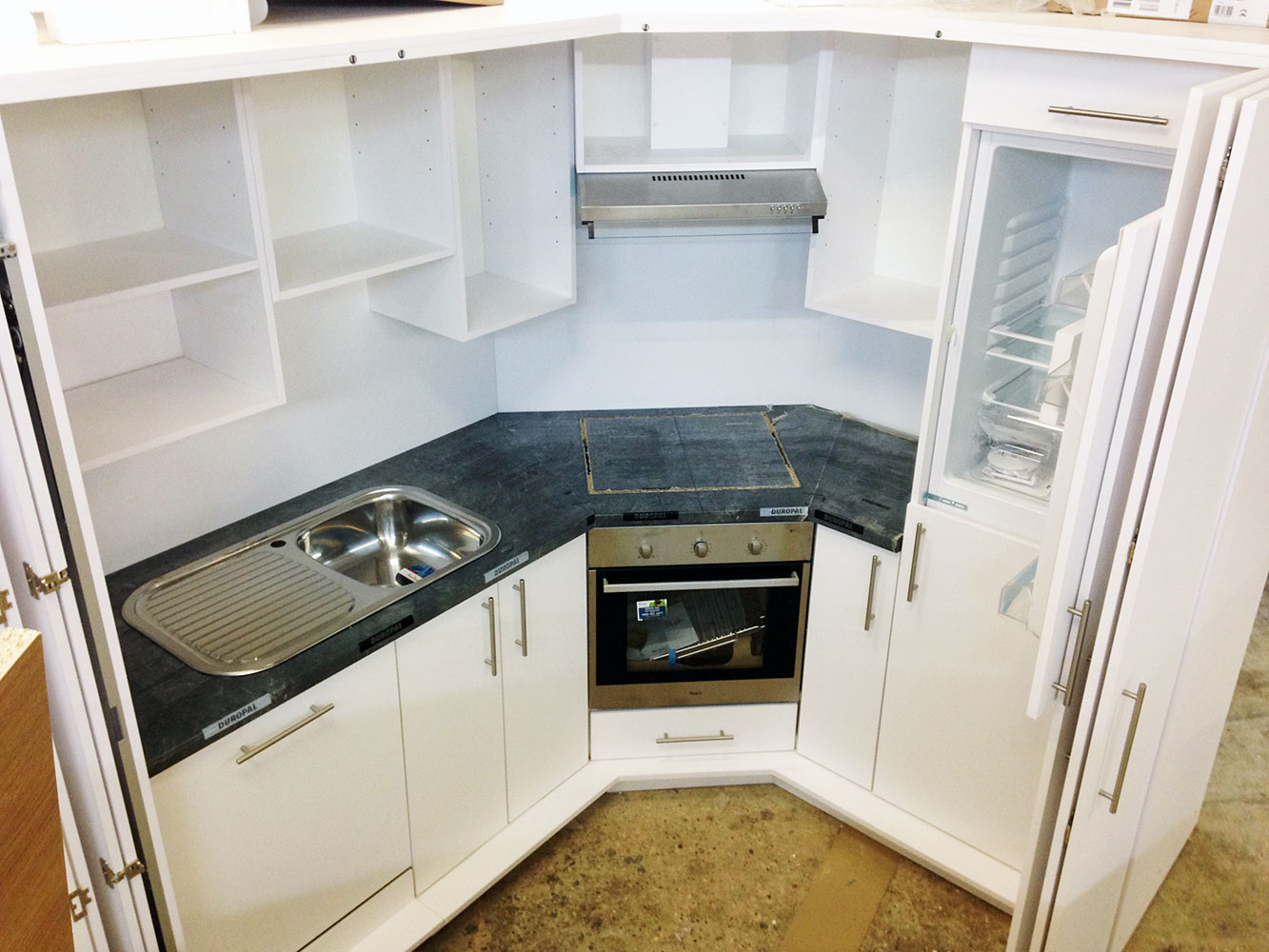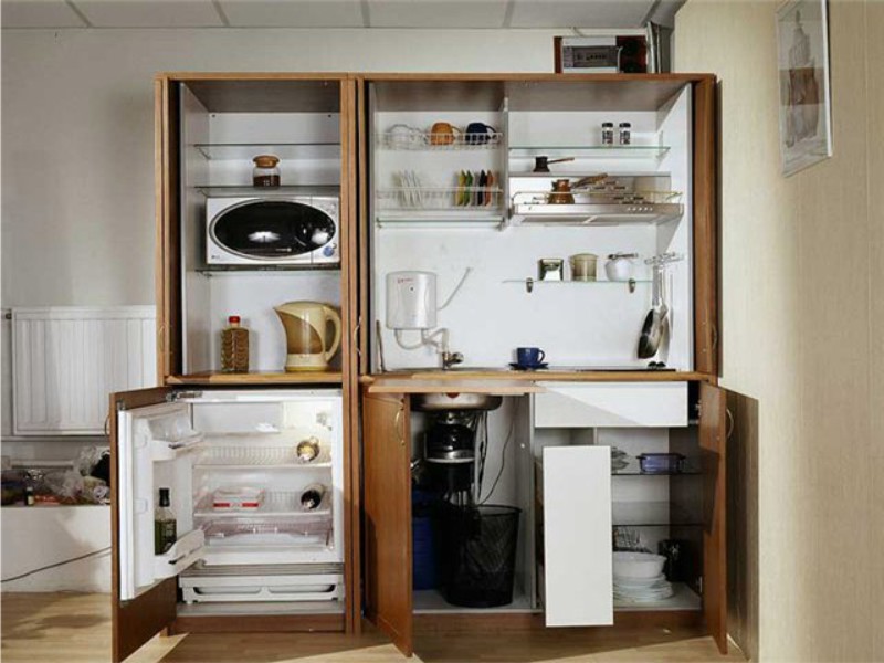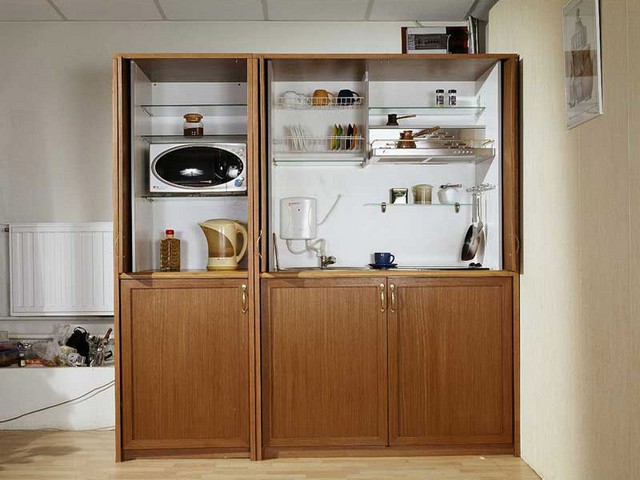 Pengilang perabot menawarkan penyelesaian turnkey dengan peralatan yang sudah terbina dalam, contohnya, seperti dapur kecil ini, dibuat dalam bentuk kabinet