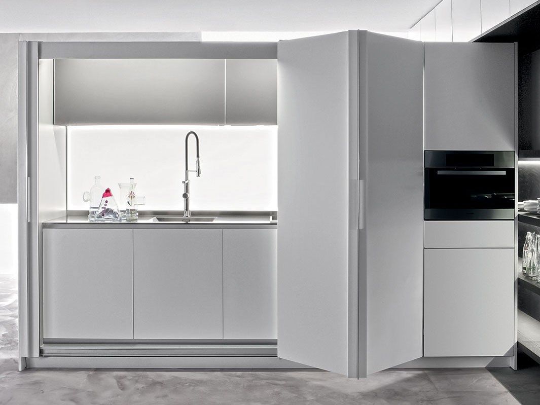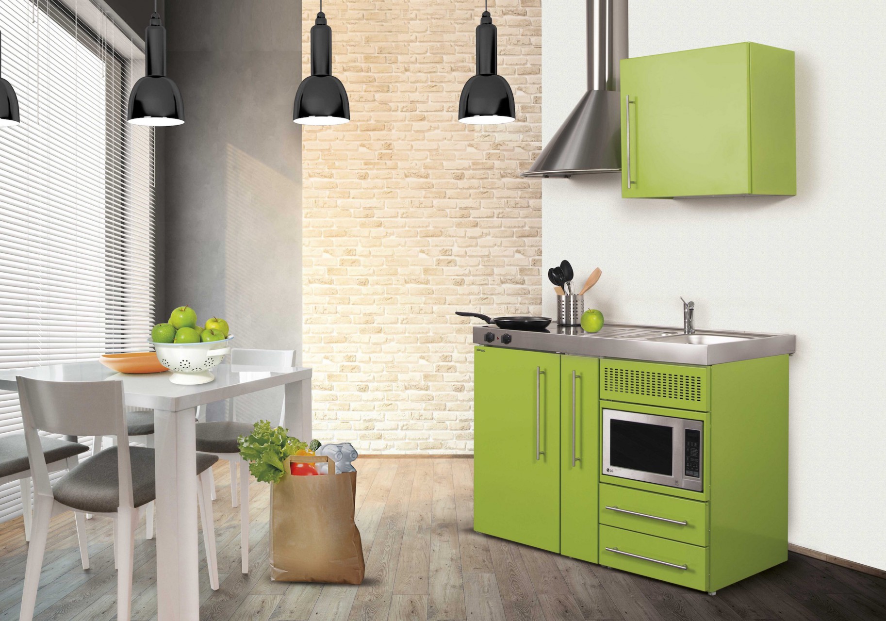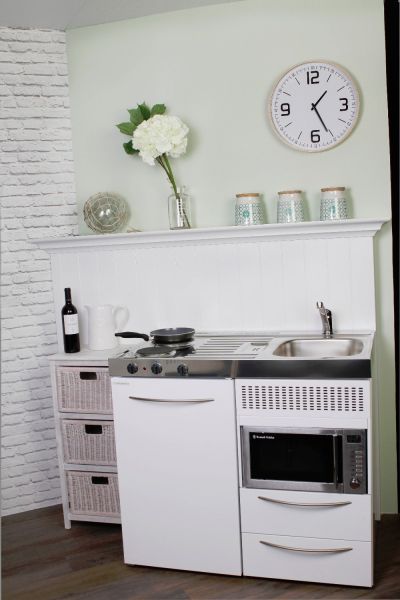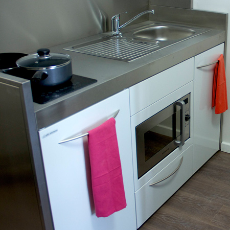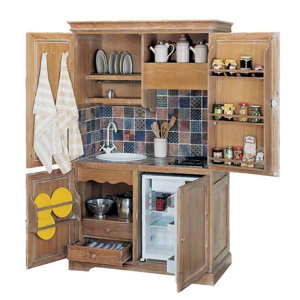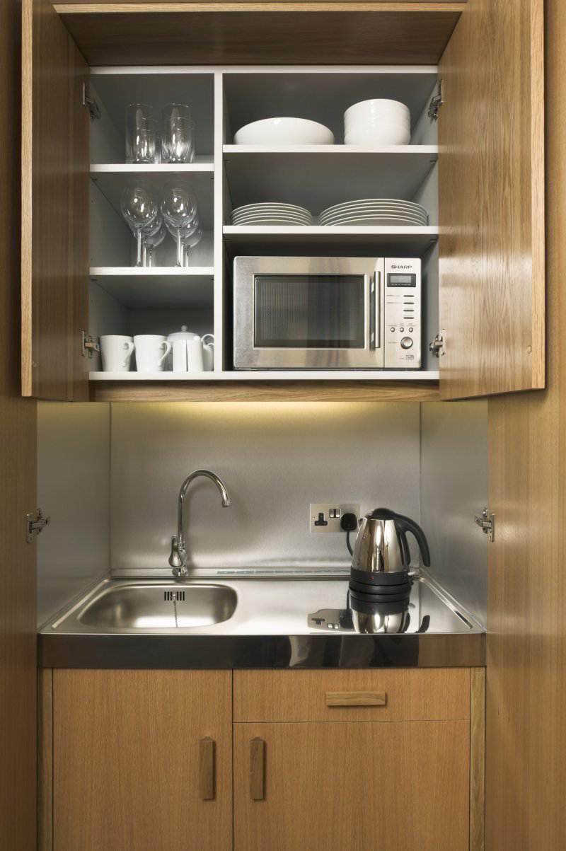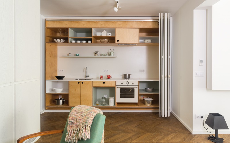 Pengilang perabot menawarkan penyelesaian turnkey dengan peralatan yang sudah terbina dalam, contohnya, seperti dapur kecil ini, dibuat dalam bentuk kabinet