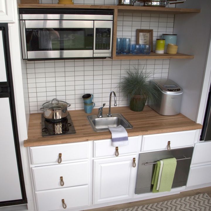 Dapur kecil modular dengan permukaan kerja MDF lamina