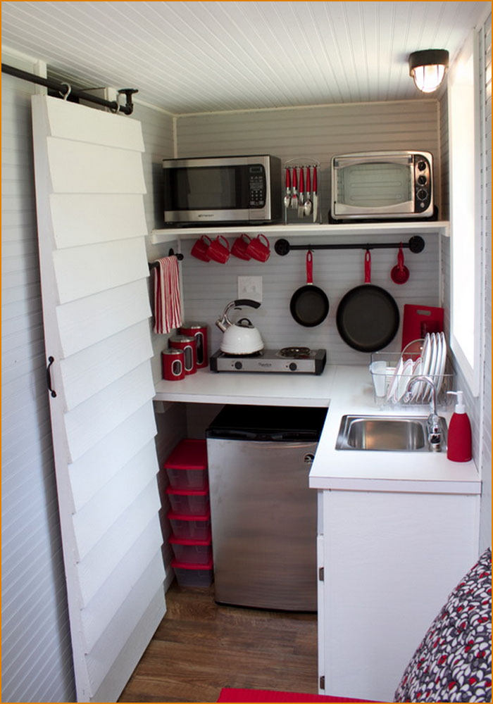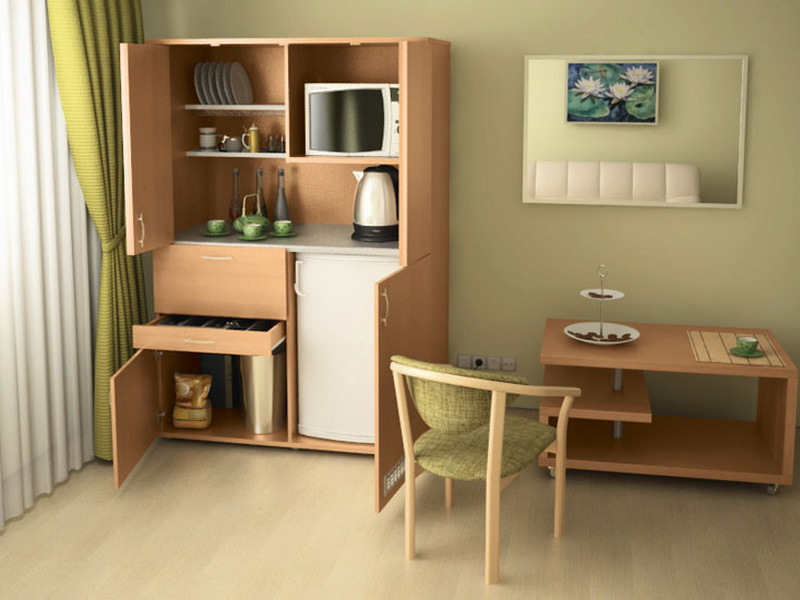 - Rumah. Terdapat kategori orang yang lebih suka makan. Dapur yang besar dengan pelbagai peralatan dan perkakas adalah tidak berguna bagi mereka, jadi pilihannya jatuh pada dapur mini untuk rumah.