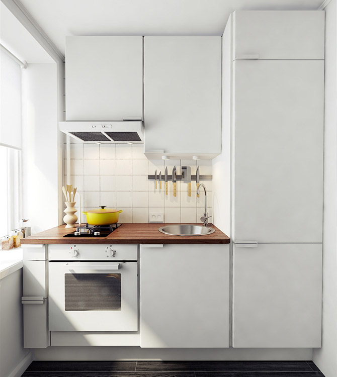 Peraturan asas untuk mencipta dapur kecil adalah kombinasi objek yang sesuai dengan pelbagai tujuan di kawasan kecil