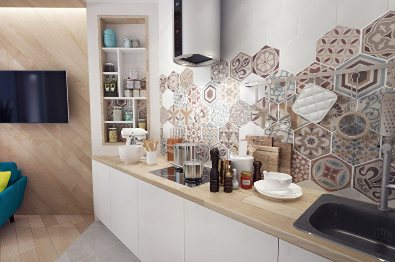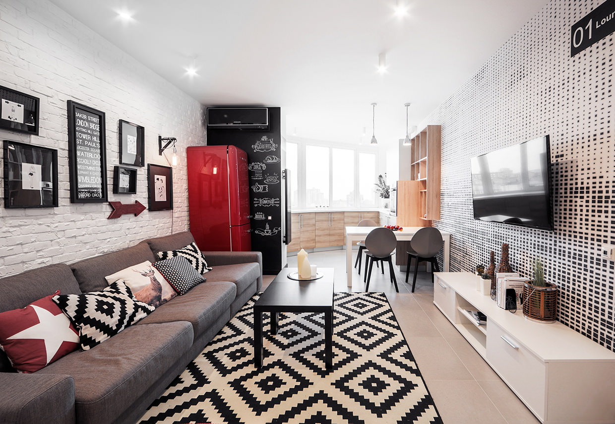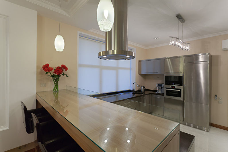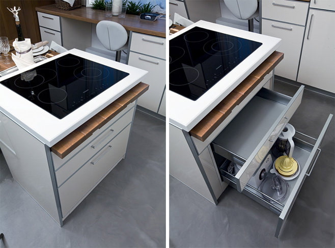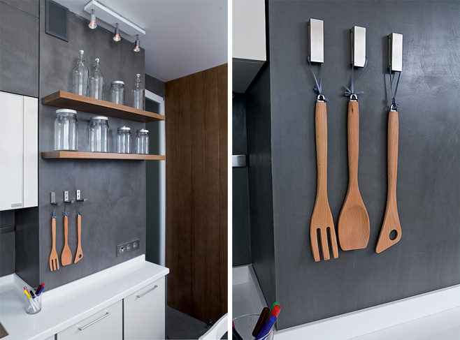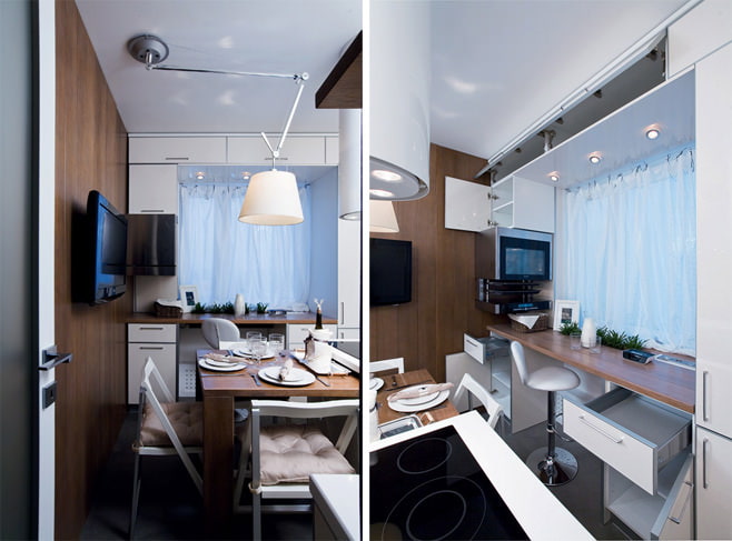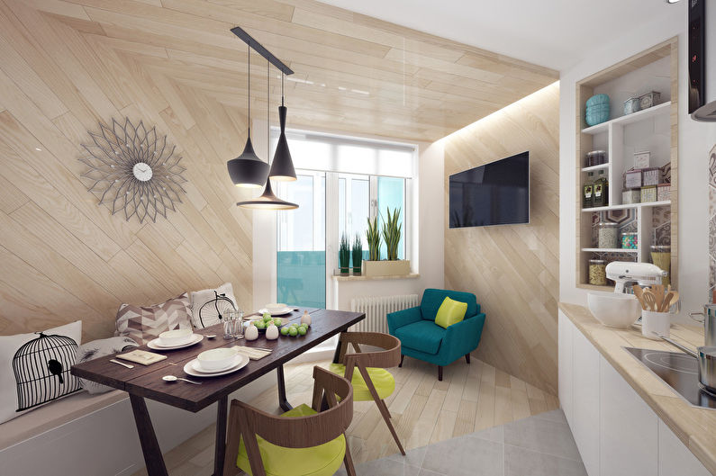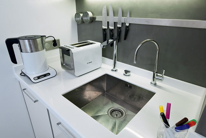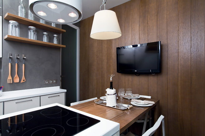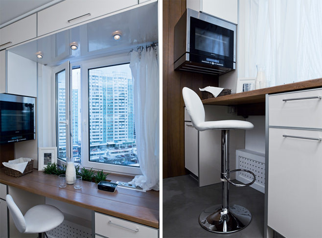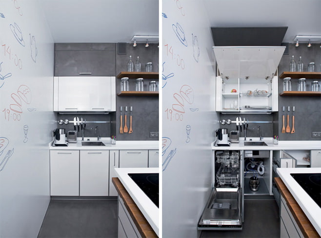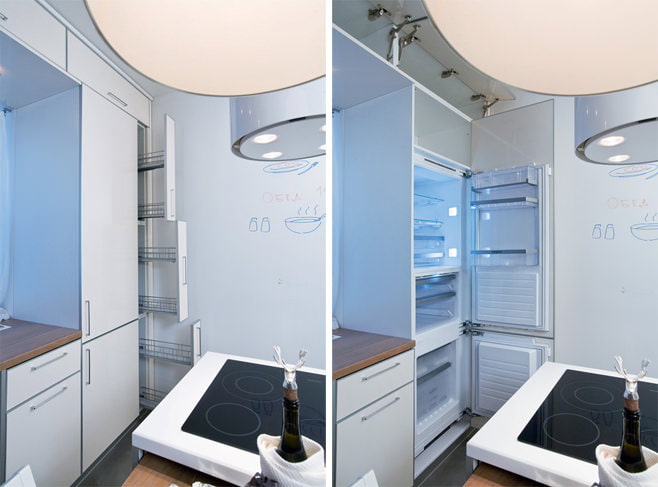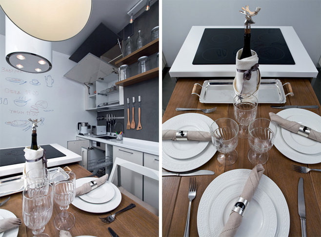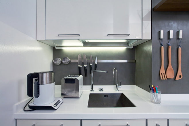 Bilik dapur-ruang makan dan ruang tamu dapur biasa di pangsapuri studio dan reka bentuk mereka adalah unik. Keputusan reka bentuk ini mempunyai kelemahan: