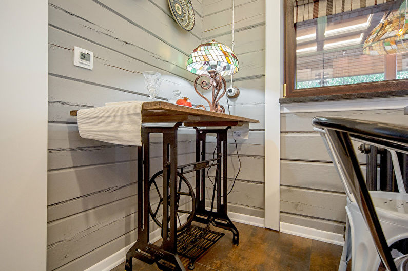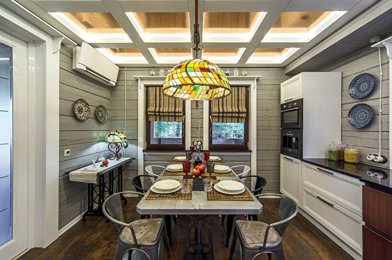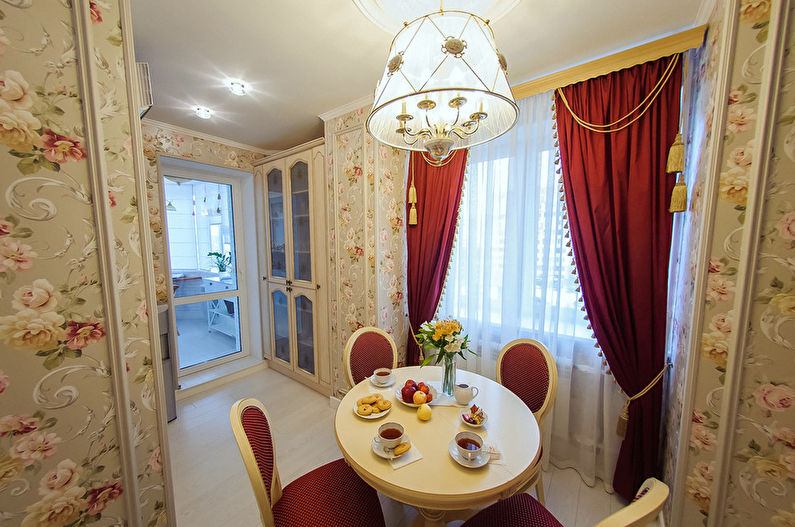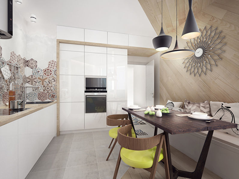 Ruang makan menambah fungsi ke dapur apabila diletakkan dengan betul. Ia sesuai untuk keluarga. Makan - meja dan kerusi (atau sofa). Ia tidak mengganggu pemasak dan tidak menghalang pengguna. Perhatian dibayar kepada skema warna.