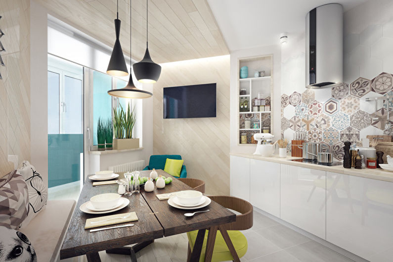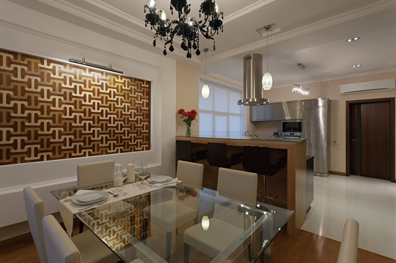Apabila merancang bahagian dalam ruang tamu dapur, bilik dibahagikan kepada separuh. Ia mudah dalam konfigurasi berbentuk L atau dua peringkat. Bilik harus terang dan mempunyai dua pusat - sebuah dapur dan sofa. Kawasan rekreasi bertentangan dengan tempat kerja.