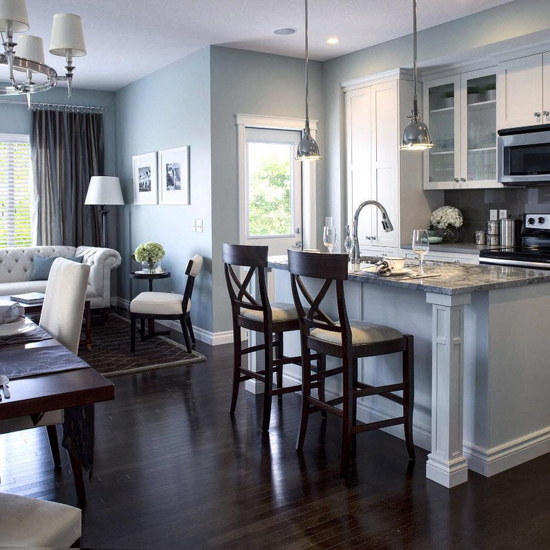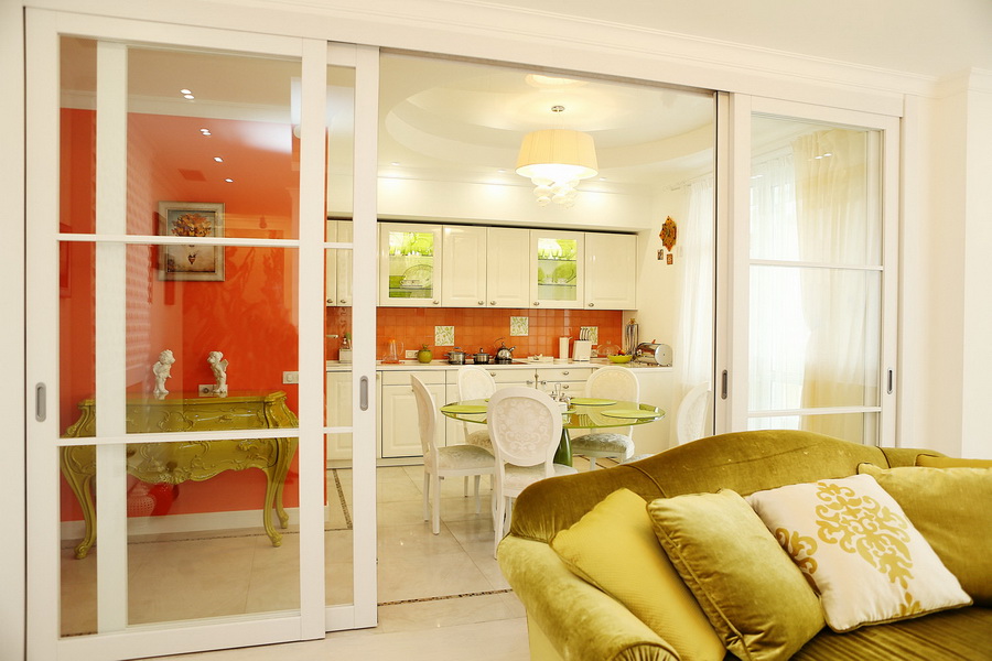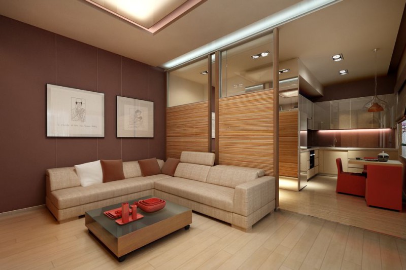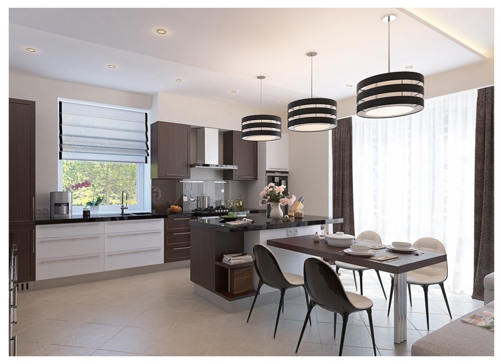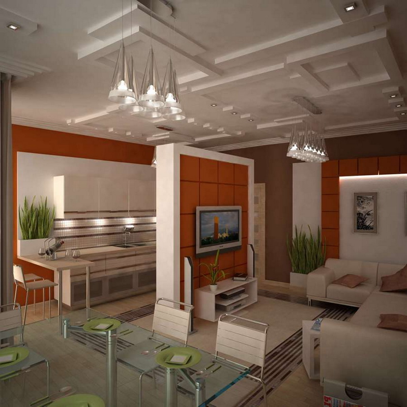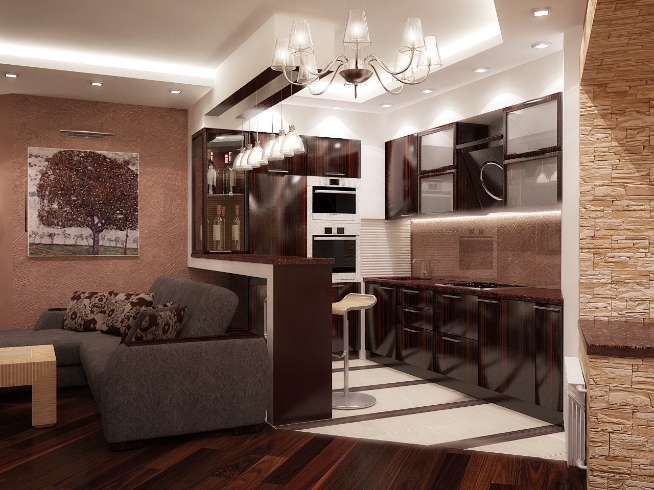 - Dapur bersambung dengan ruang tamu: membahagikan ruang dengan hiasan