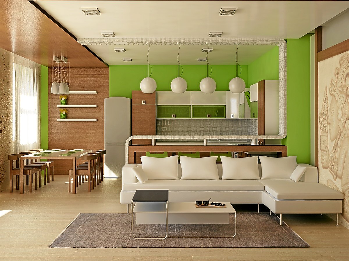 Dapur bersambung dengan ruang tamu: membahagikan ruang dengan hiasan