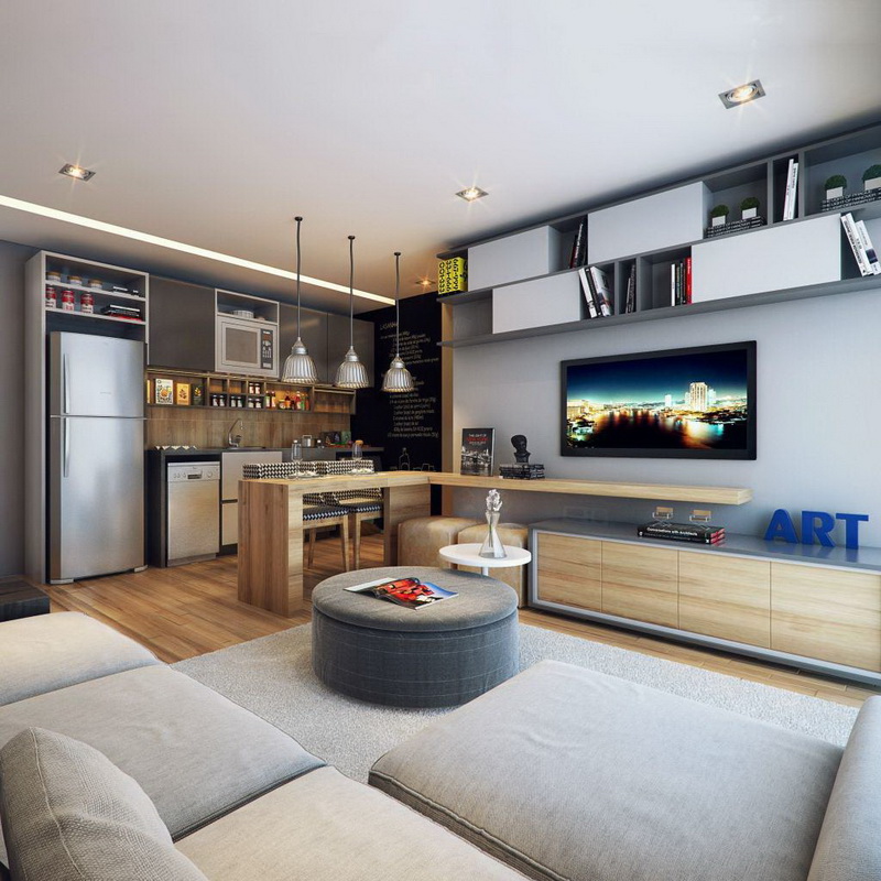 Perabot yang sesuai dan susunannya, jika dapur dan ruang tamu adalah satu bilik.
