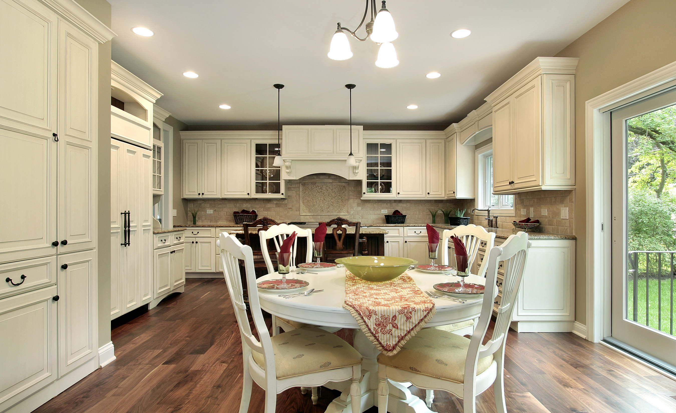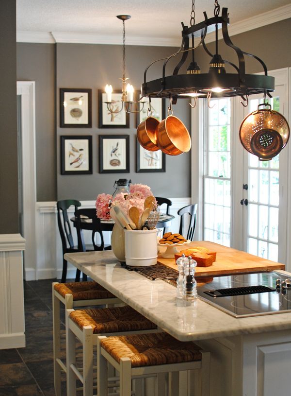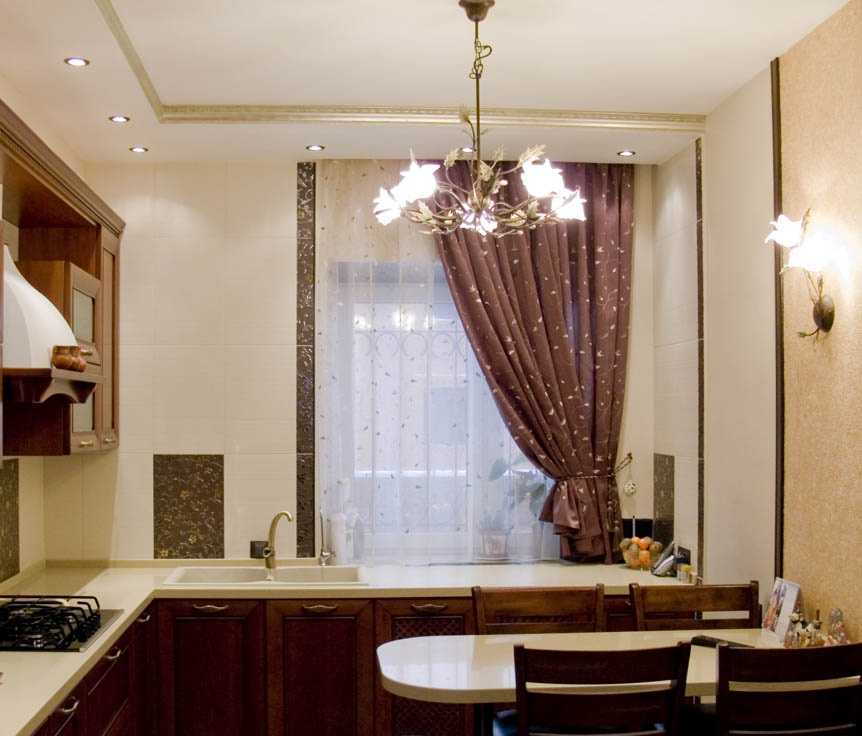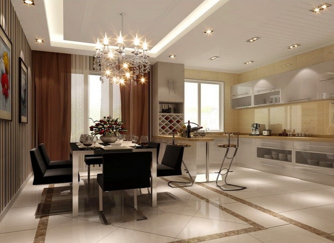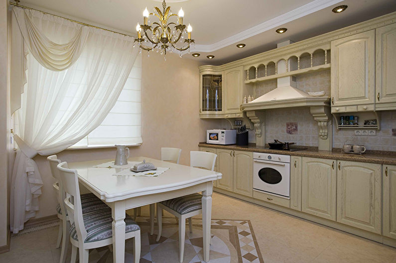 Lampu kandil di dapur seperti dalam gambar di pedalaman harus diatur bergantung pada ketinggian siling. Cahaya harus menerangi meja makan, bukan mata buta.