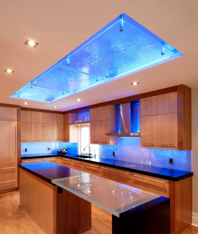 Spektrum pelepasan lampu elektrik titik sangat dekat dengan solar. Cahaya lembut mereka dalam reka bentuk dapur seperti dalam gambar sangat popular di kalangan jenis pencahayaan lain.
