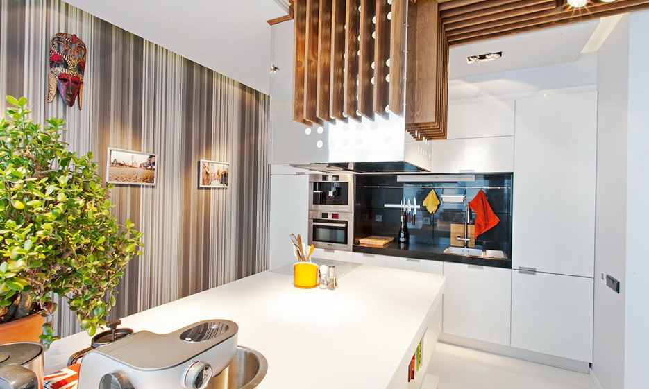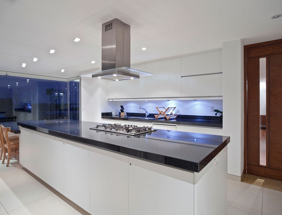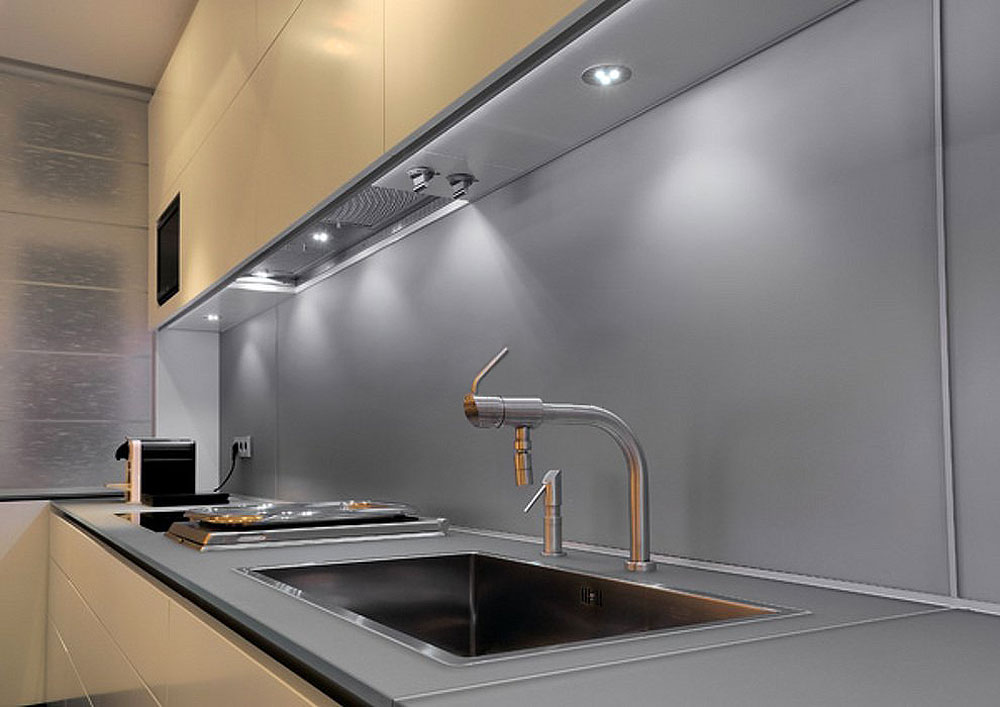 Untuk menerangi dapur atau dapur, cukup dipasang dengan lekap dipasang di atas permukaan hud. Lampu harus diarahkan secara tegas, tanpa kesan silau.