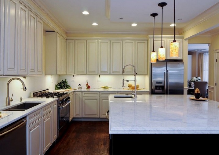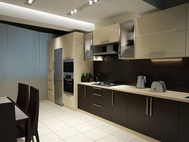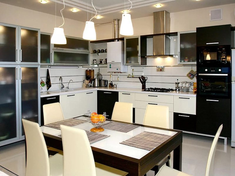 Pencahayaan di dapur perlu pelbagai peringkat dan sesuai dengan setiap ruang berfungsi di dalam bilik. Dapur dibahagikan kepada kawasan kerja dan ruang makan. Bagi setiap bahagian, perlu memilih tahap pencahayaan yang berbeza. Lampu asas harus sama rata di seluruh bilik.