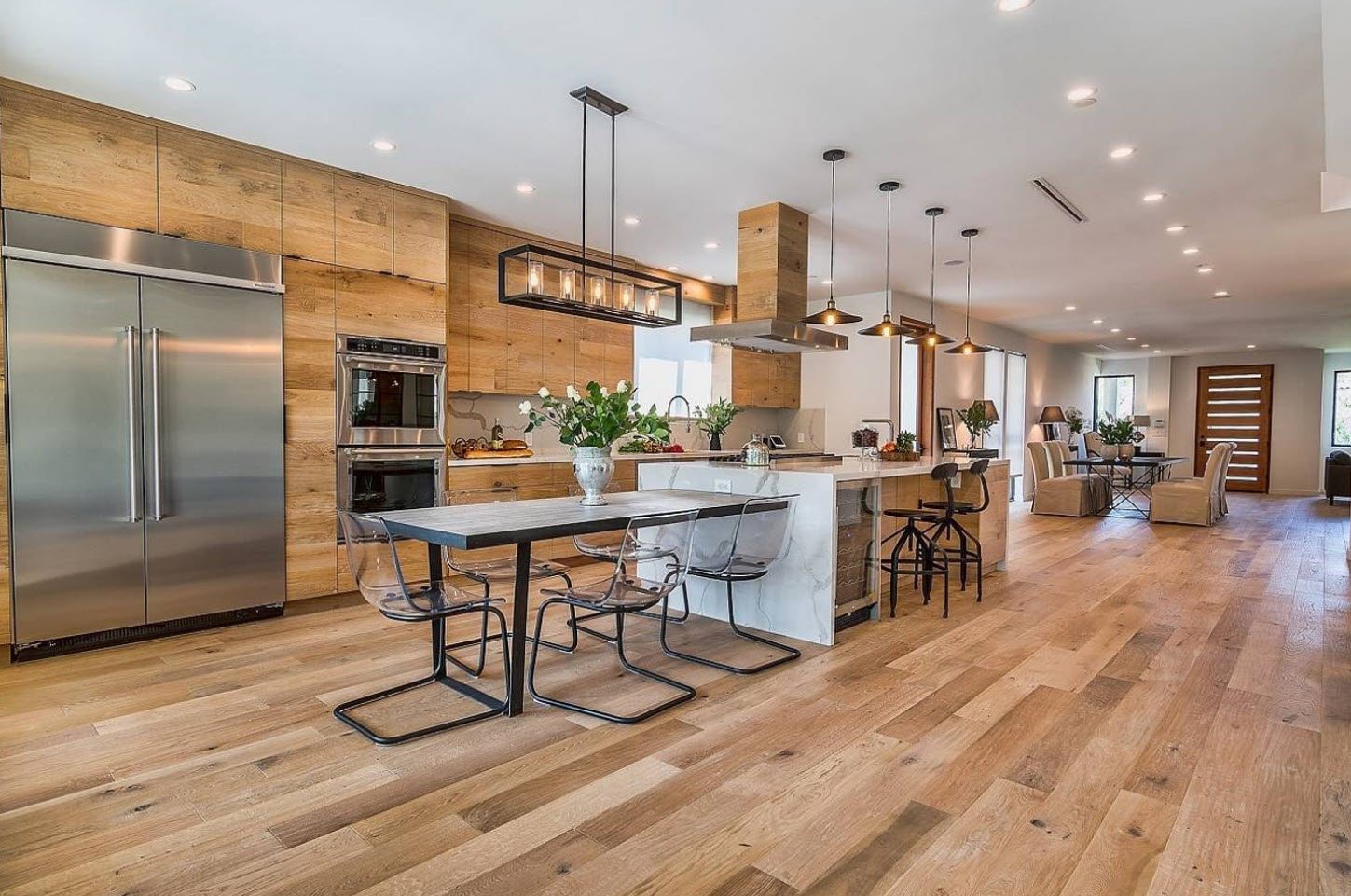 - Sekumpulan luminair yang ditempatkan secara berturut-turut atau pada jarak sewenang-wenang antara satu sama lain akan menambah penekanan yang berani ke ruang makan.