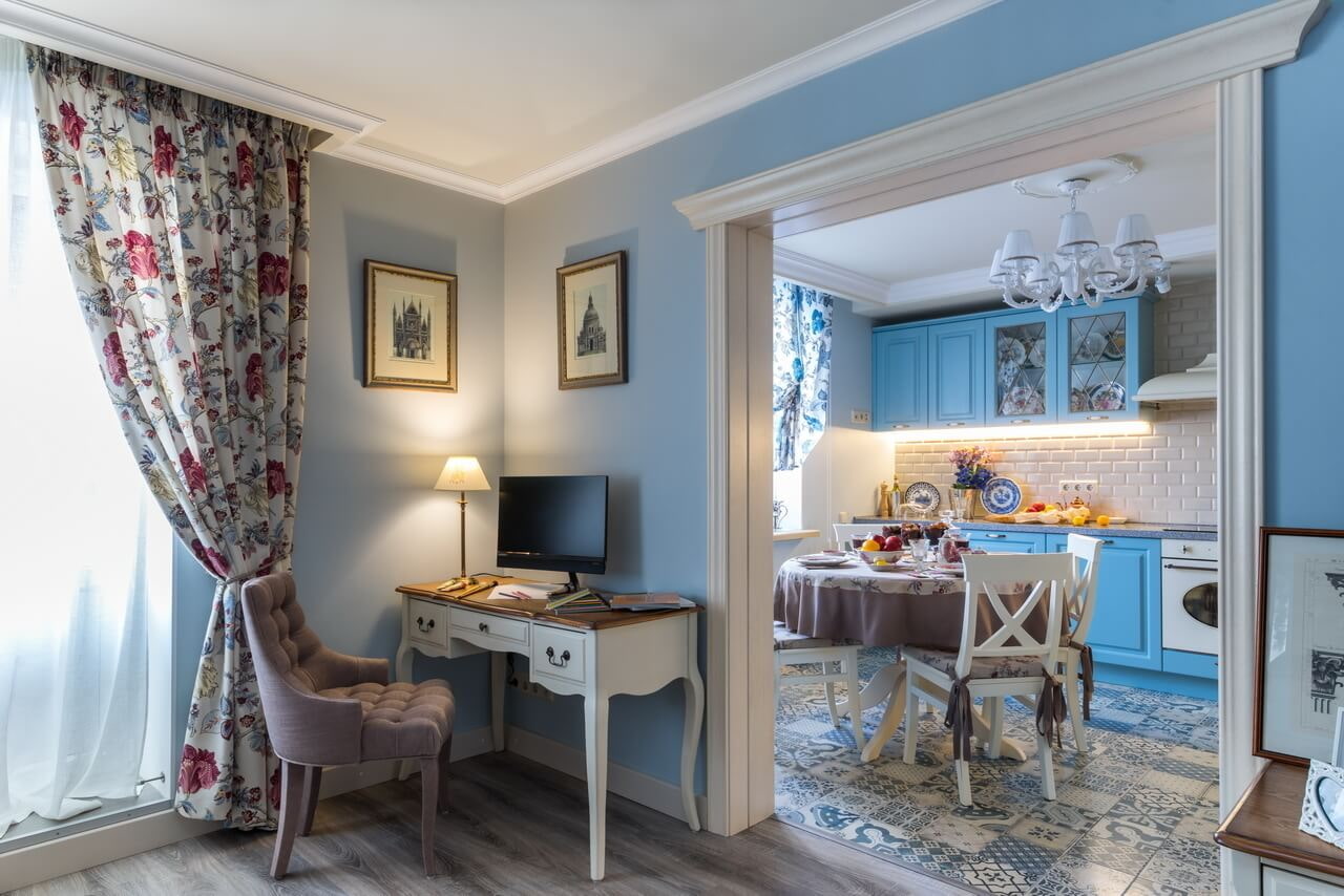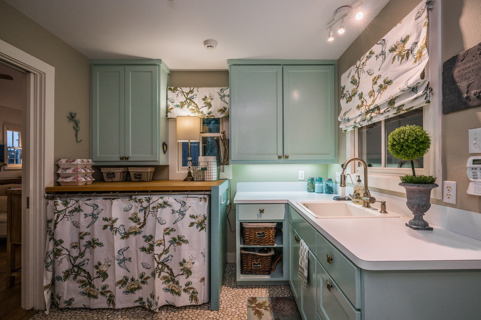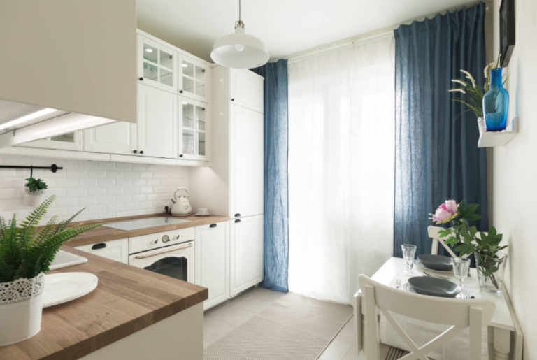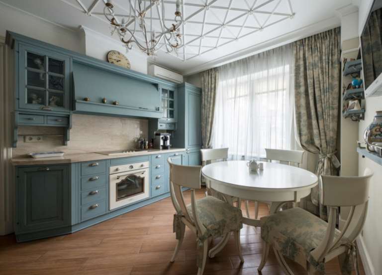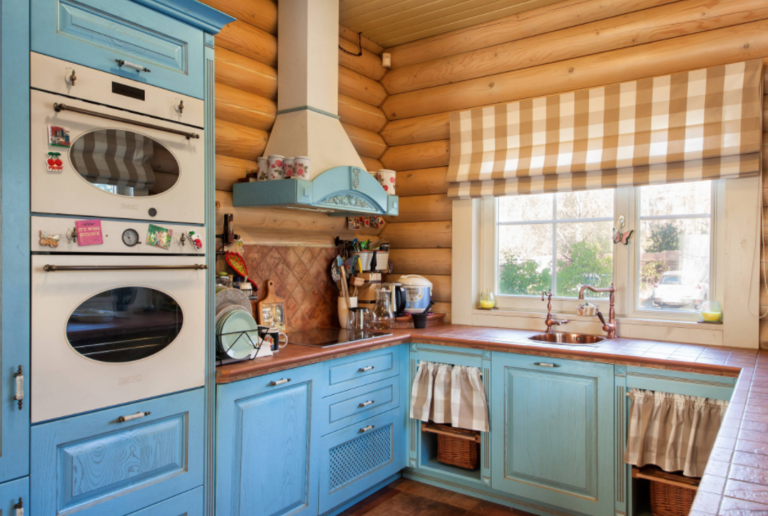 Langsir simetri dalam warna biru terang akan menghiasi bahagian dalam dapur.