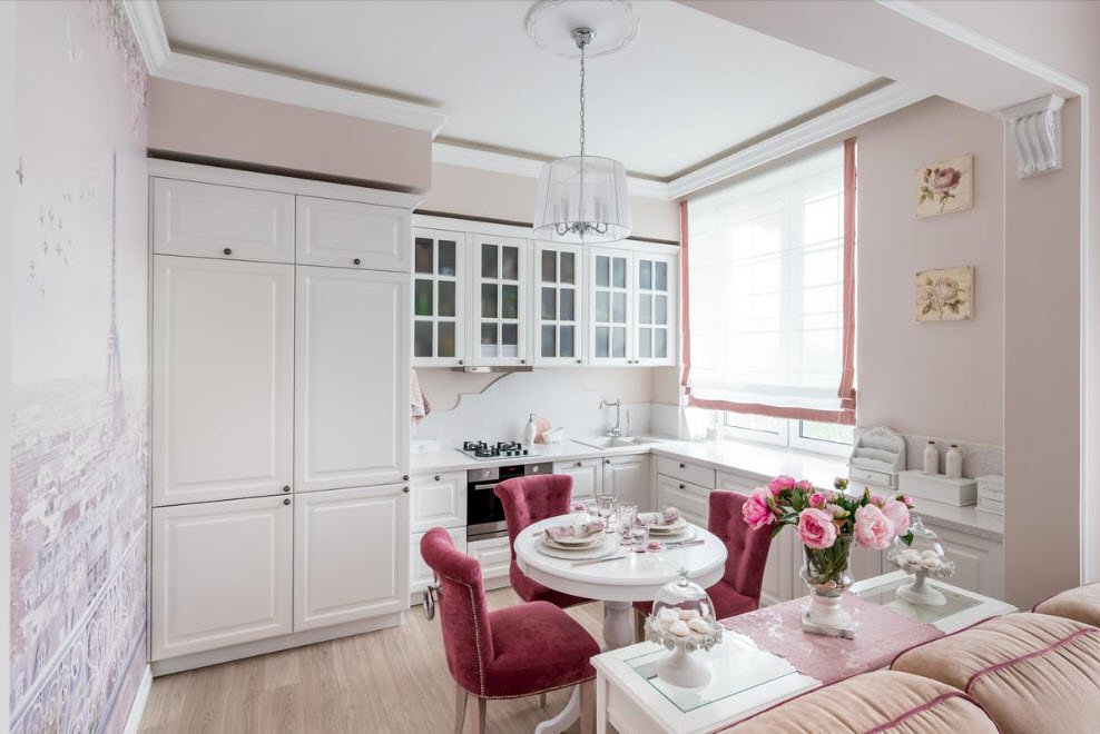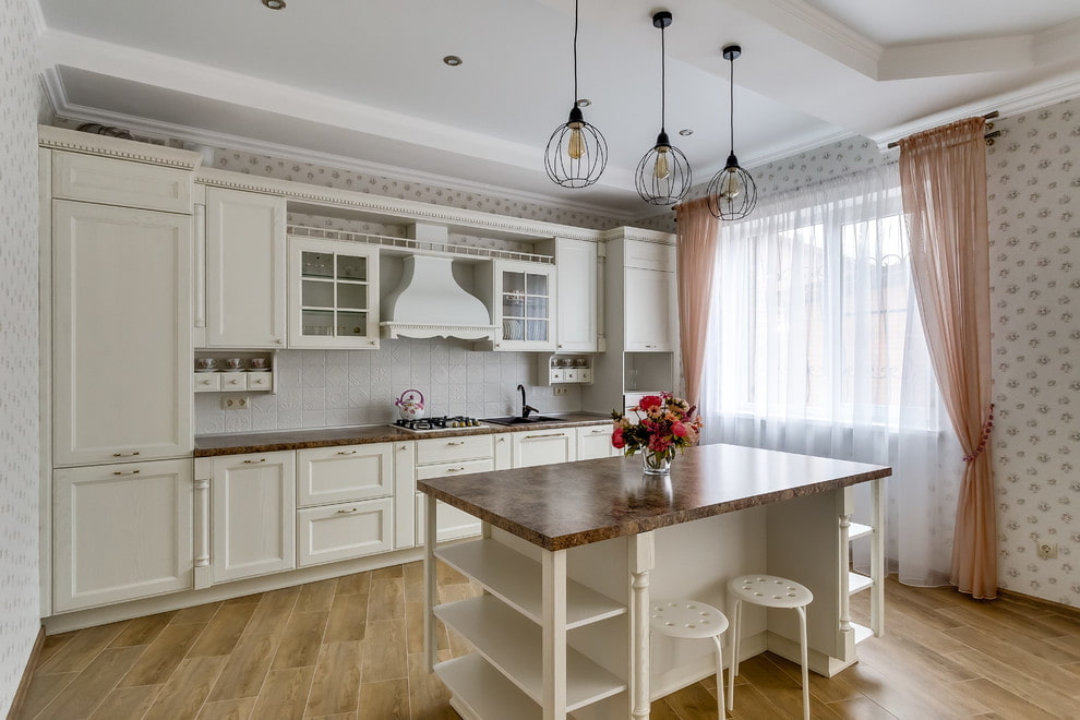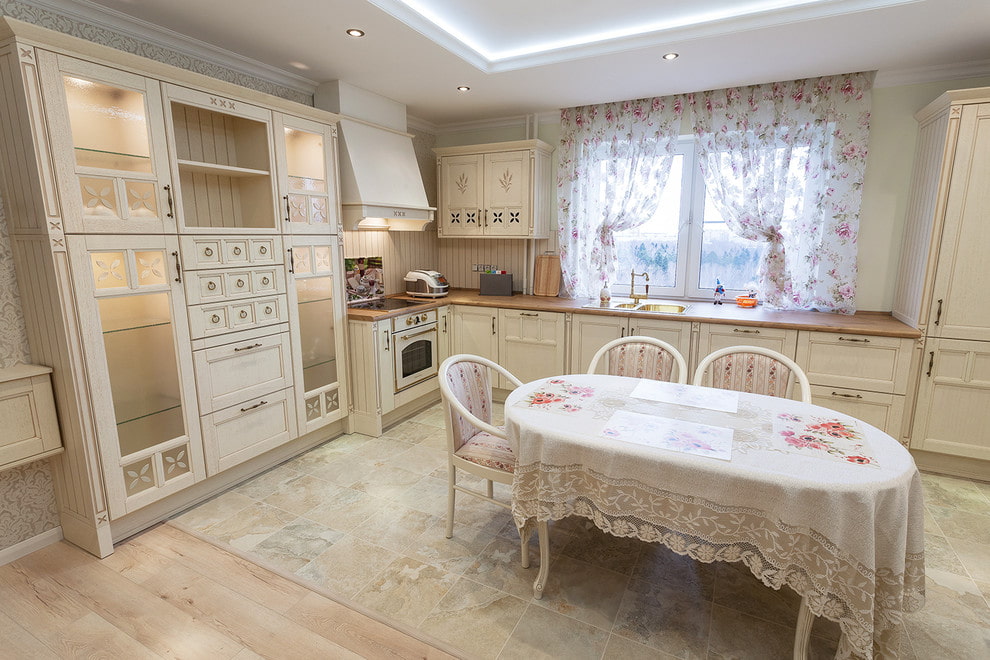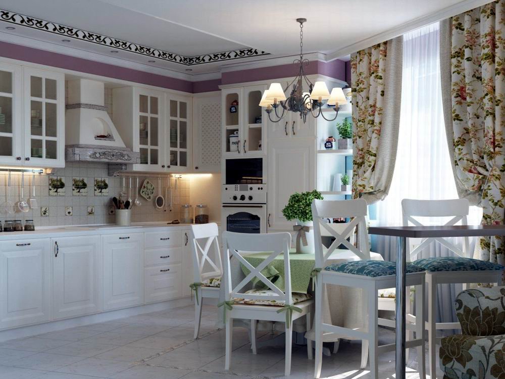Provence sedikit bersifat kuno, tetapi pada masa yang sama cahaya, elegan. Dapur gaya ini kelihatan segar, secara semula jadi, ia adalah selesa. Pilihan yang sangat baik untuk kedua-dua bilik kecil dan ruang tamu dapur yang besar.Beri perhatian bukan sahaja kepada pilihan bahan, tetapi juga untuk cornice. Ia harus mudah, keluli atau kayu. Petua - dalam bentuk bola, anak panah atau kon.