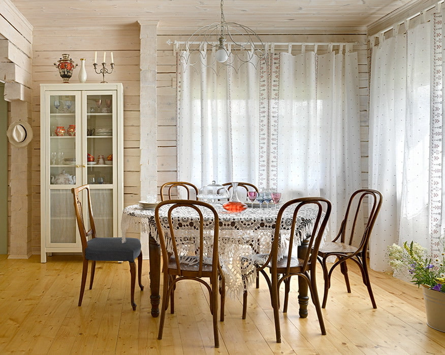 Untuk gaya desa, yang mana Provence dekat, penggunaan kain dengan corak geometri mudah adalah ciri. Suatu vichy atau tartan sel sempurna dilengkapi dengan ruffles atau embel-embel, tetapi secara sederhana. Strip nipis juga bagus, membolehkan anda menggabungkan beberapa warna dan dengan itu membawa dinamik ke pedalaman. Peas juga kelihatan asli, tetapi anda perlu berhati-hati memilih corak, kerana kacang besar tidak akan kelihatan harmonis.