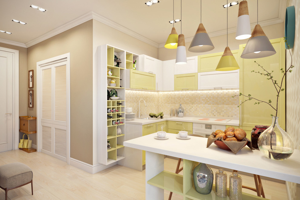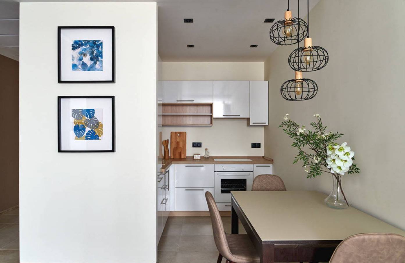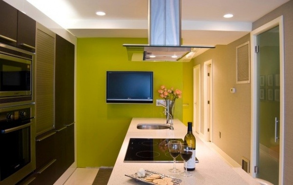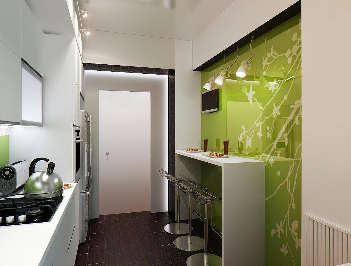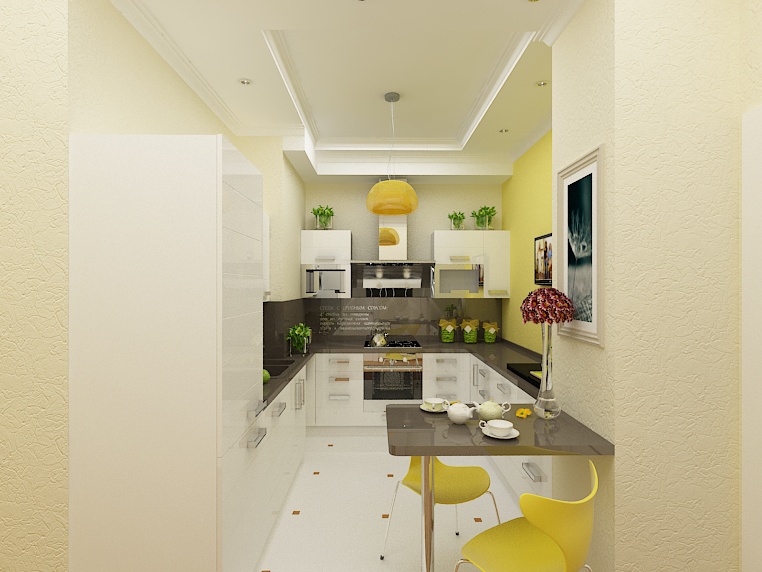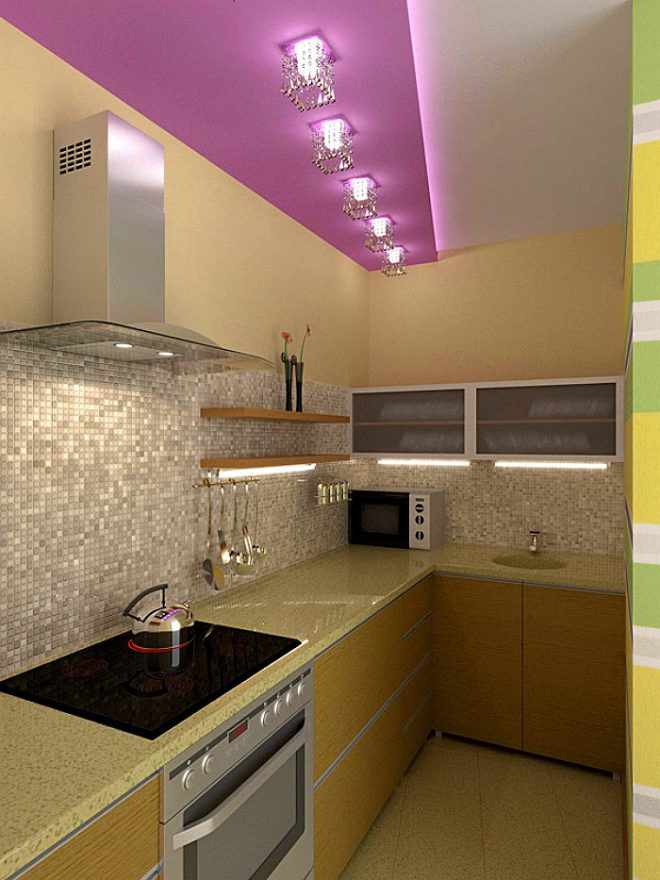 Reka bentuk dapur kecil tanpa tingkap: warna cahaya di atas semua