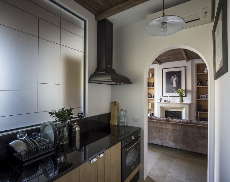 Dapur tanpa tingkap hanyalah alasan untuk menyambung inspirasi dan keupayaan untuk menggunakan kemahiran yang bijak. Projek yang disorot menjadi contoh. Perkara yang paling penting adalah untuk tidak menyelamatkan projek pencahayaan, kerana ia adalah dari dia bahawa suasana rumah tangga akan ditolak.