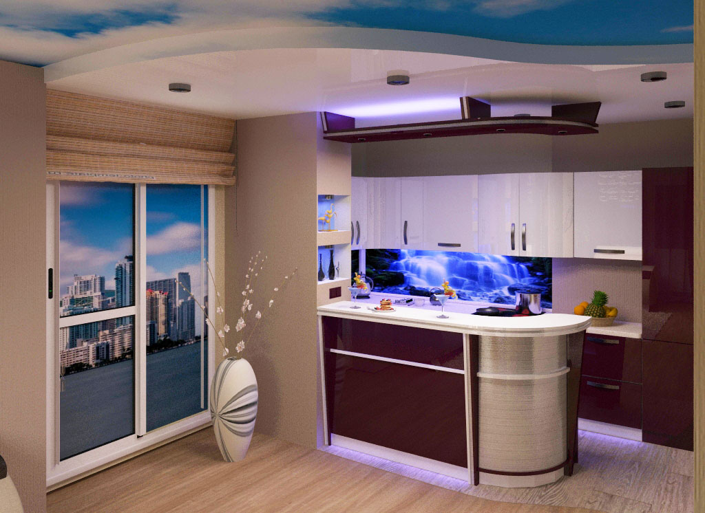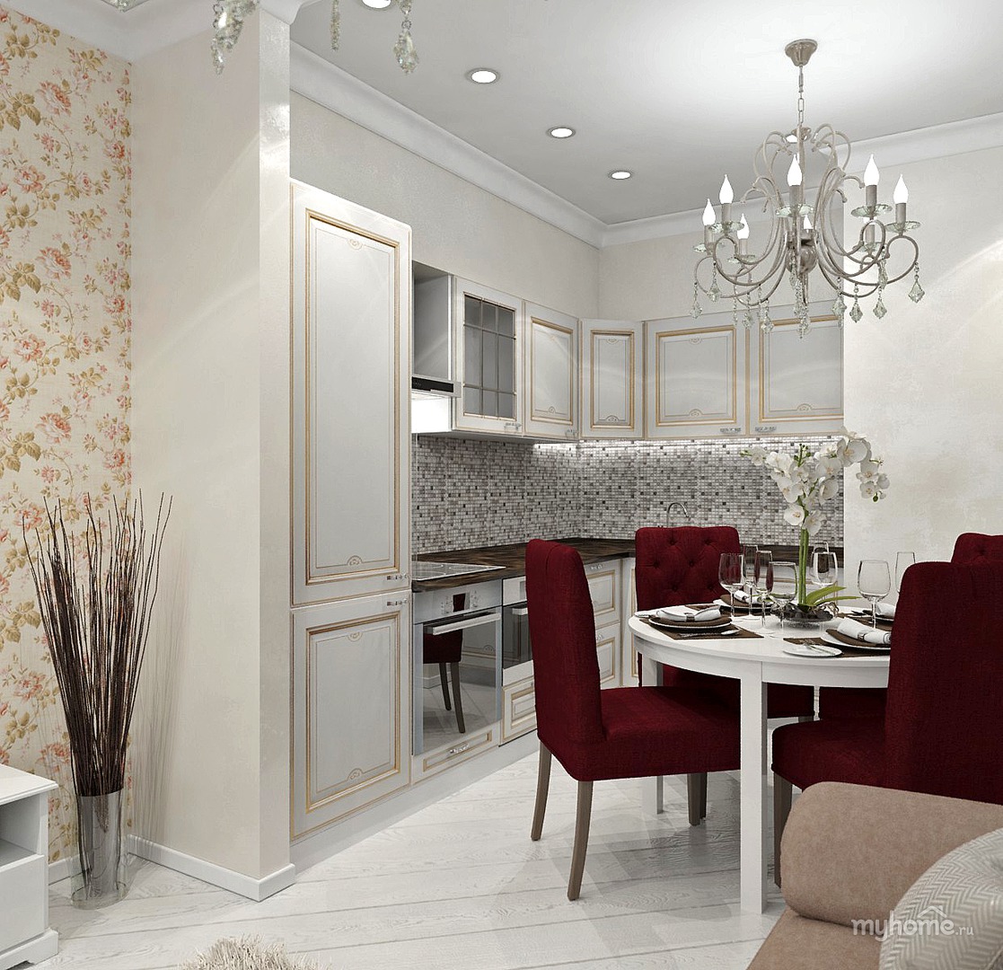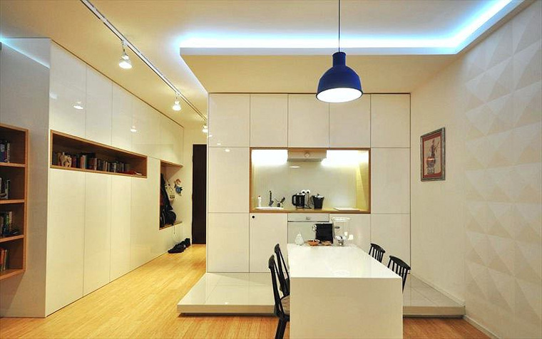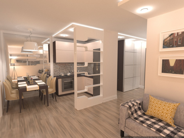 - Dapur kecil boleh dibuat walaupun di apartmen studio. Bilik yang berasingan untuk memasak jauh lebih baik jika digabungkan dengan bahagian kediaman.