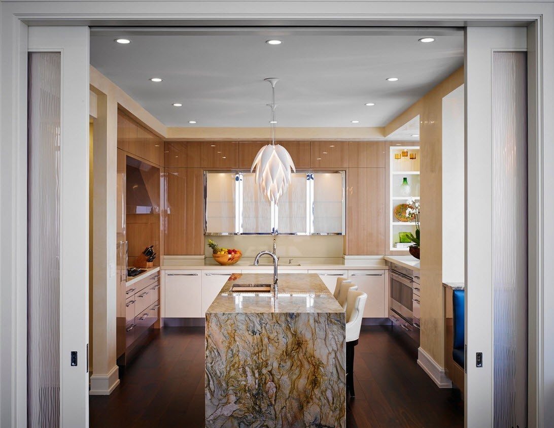 - Dapur dengan pulau - pilihan ini akan membolehkan anda memasang seberapa banyak lampu yang mungkin, yang akan zonate ruang.