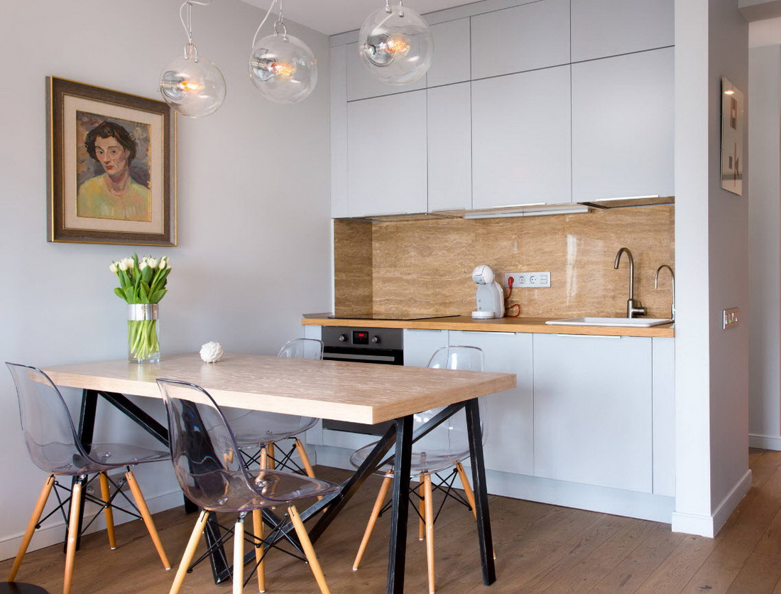 Salah satu hacks hayat yang paling sesuai yang ditawarkan oleh para pereka adalah untuk menjadikan bilik itu cerah. Ini akan membantu nada tenang yang tidak akan menyerap cahaya, tetapi mencerminkannya. Dengan cara ini, cadangan yang sama adalah relevan bagi mereka yang ingin meningkatkan ruang bukan sahaja dapur, tetapi bilik (jika kita bercakap mengenai apartmen studio).