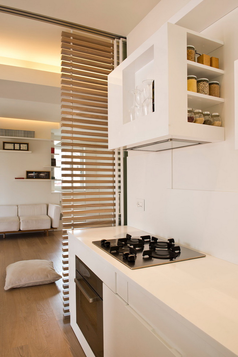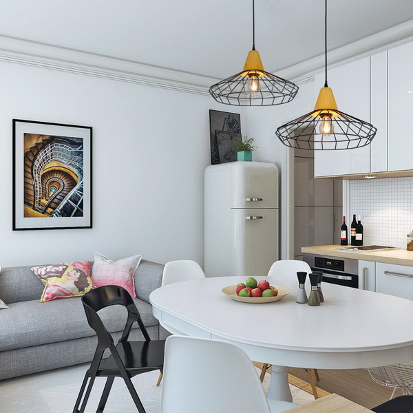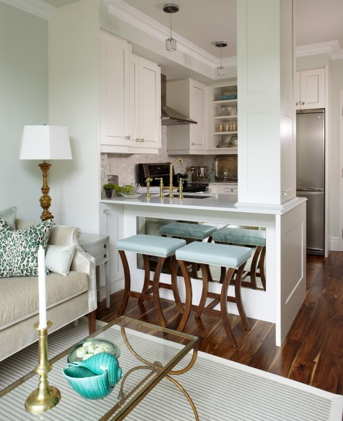Ruang tamu dapur putih kelihatan cantik, mudah dan visual lebih besar daripada yang sebenarnya
