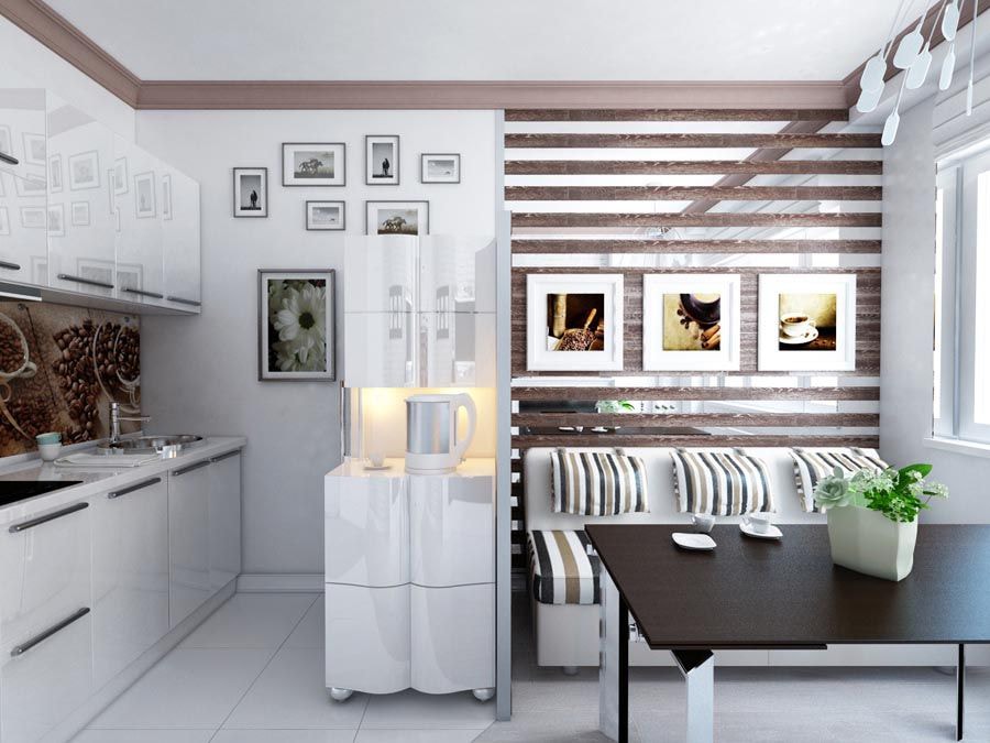 - Kaedah reka bentuk zon: susun atur dengan peti sejuk dan pilihan lain untuk mengatur bilik