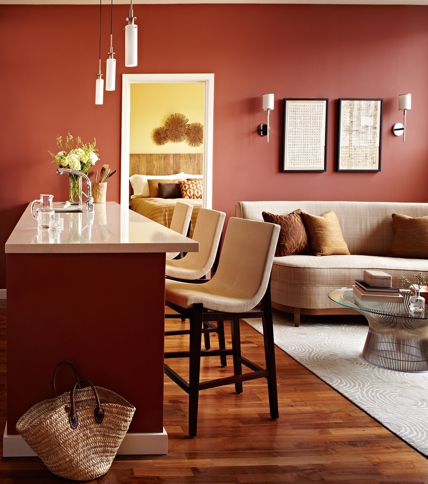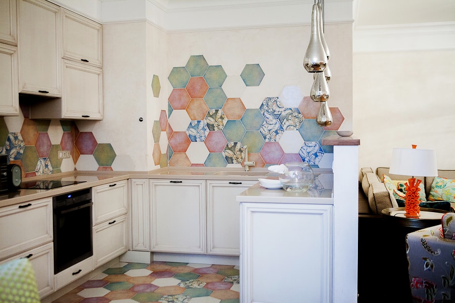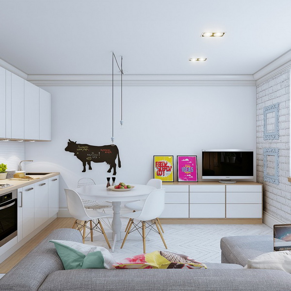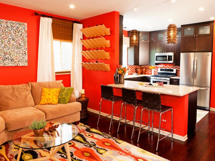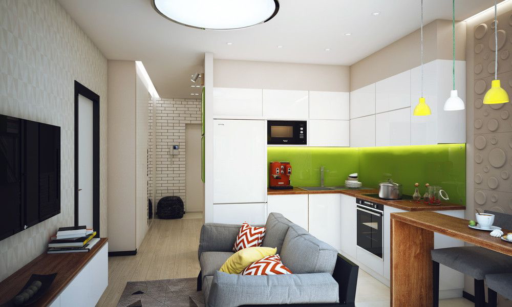 Dinding warna-warna yang berbeza menunjukkan kawasan fungsional dan membuat bahagian dalam dapur ruang tamu lebih menarik.