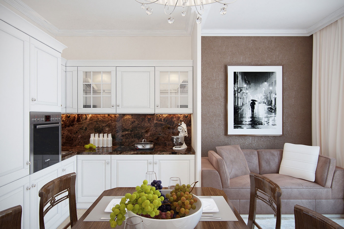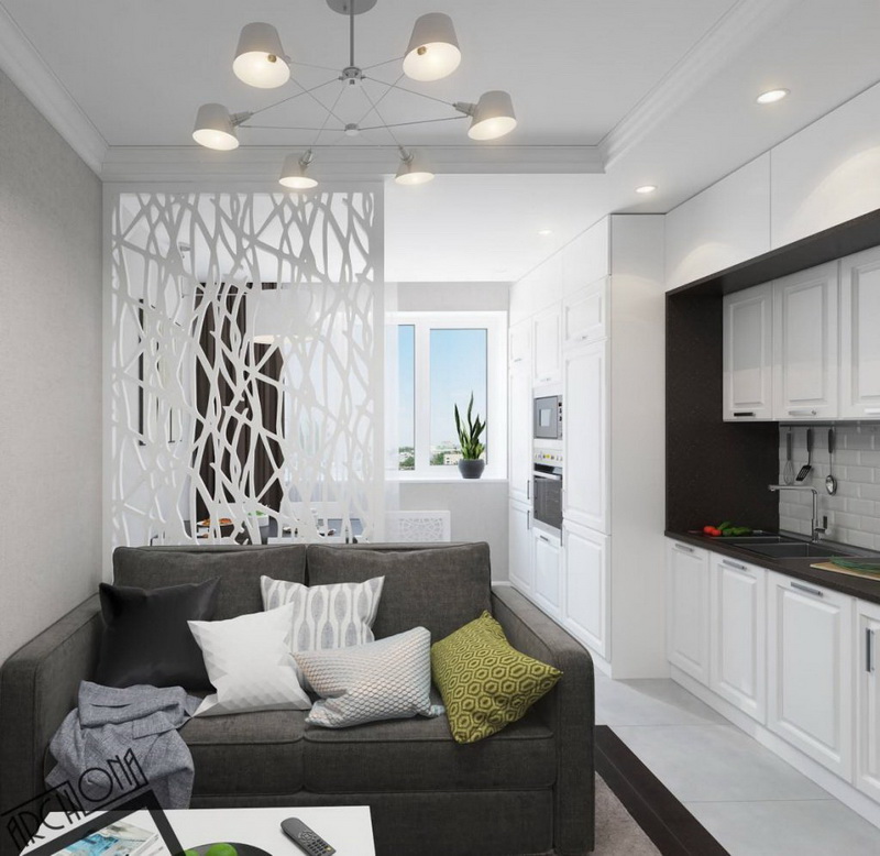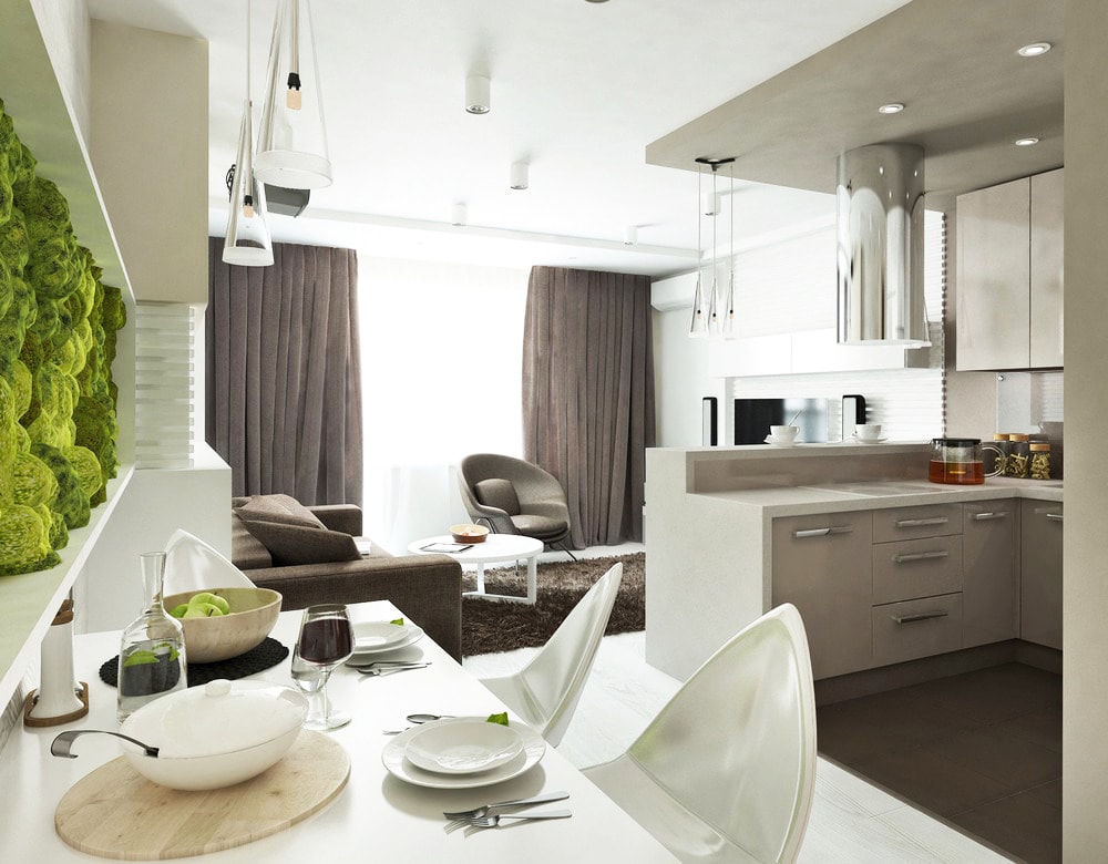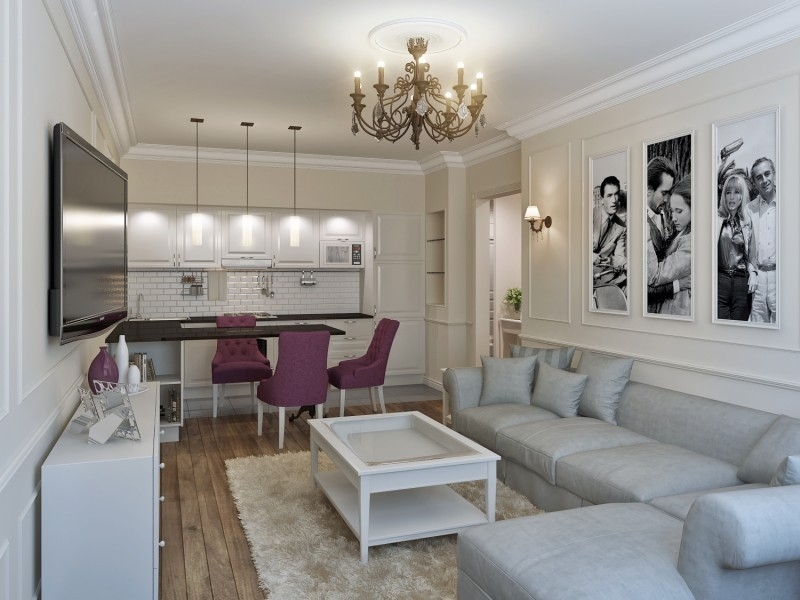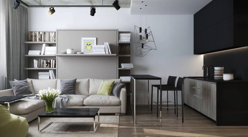 Dengan menggabungkan dapur dengan ruang tamu, anda boleh meningkatkan kawasan yang boleh digunakan sebuah apartmen kecil dan menjimatkan banyak kerana tidak perlu membeli satu set perabot di ruang tamu yang berasingan. Pada 15 meter persegi anda boleh menterjemahkan ke dalam realiti hampir apa-apa gaya dalaman, walaupun yang paling kreatif.