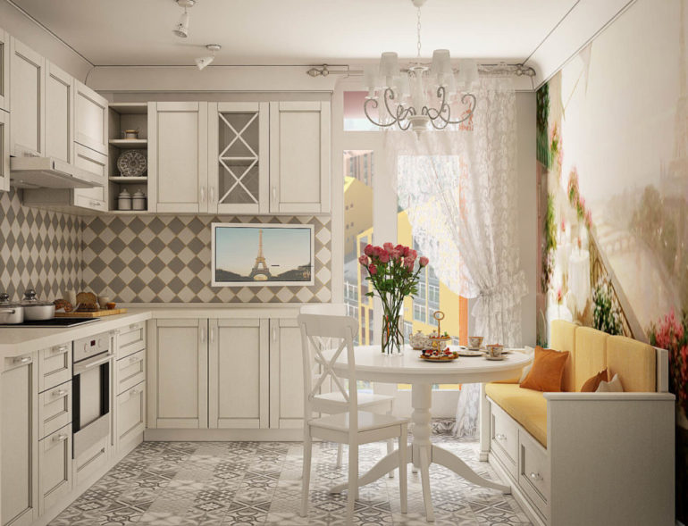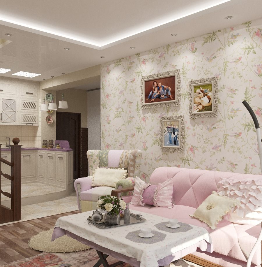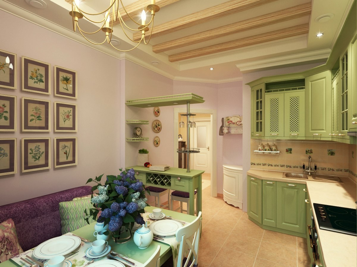 Reka bentuk dapur-ruang tamu di gaya Provence membolehkan anda mencipta ruang dalaman yang selesa dan hangat