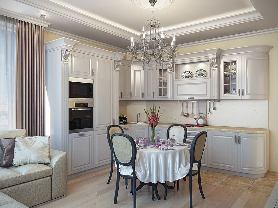 - Klasik - bagi mereka yang suka dalaman yang bergaya. Sangat sukar untuk menyedari gaya ini dalam reka bentuk dapur ruang tamu di kawasan kecil, oleh itu, kebanyakan bilik-bilik ini dihiasi dengan gaya klasik moden, yang merupakan kompromi antara kemewahan dan kepraktisan. Di sini anda boleh melihat kelancaran garisan, sejumlah besar elemen hiasan, warna mulia dan bahan hiasan perabot mahal. Untuk tirai hiasan tingkap dengan lambrequins digunakan.