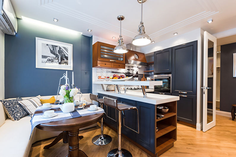 Bahagian dalaman yang mulia dan keras di dapur ruang tamu berwarna biru