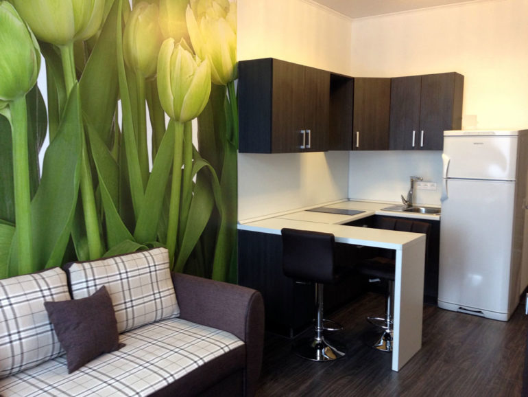 - Kawasan dapur kecil boleh menimbulkan kesulitan, terutamanya jika terdapat banyak tetamu atau penduduk di apartmen, terdapat kanak-kanak kecil atau ahli keluarga tua. Pilihan penginapan ini lebih sesuai untuk keluarga kecil.