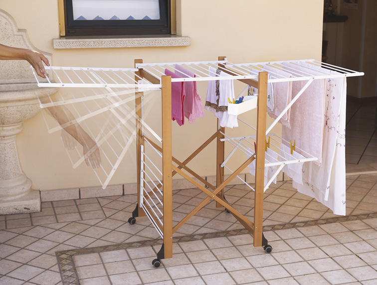Sekiranya ruang membenarkan, anda boleh mengambil pendirian lipat. Terima kasih kepada mekanisme lipatan, ia boleh diadakan di mana-mana sahaja. Dengan pengeringan lengkap pakaian, anda boleh menyembunyikan pantri, almari pakaian. Untuk mempercepat pengeringan, lebih baik memasang peranti berhampiran sistem pengudaraan.