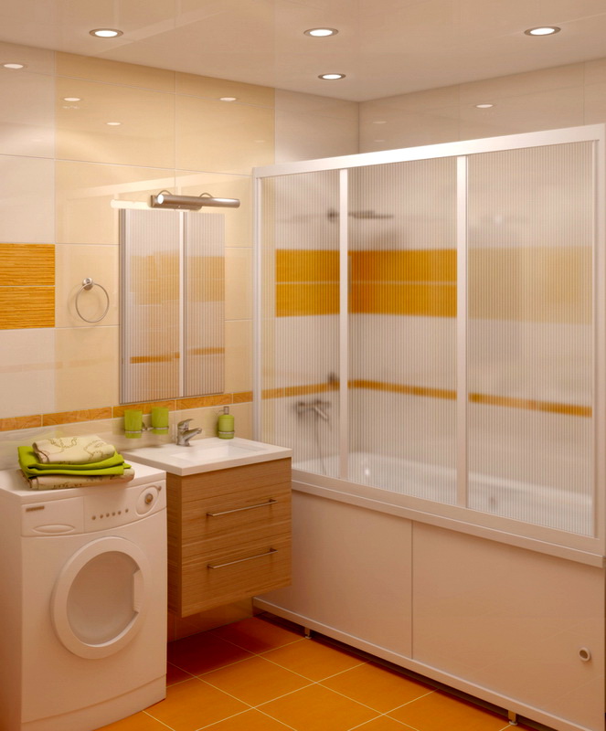 Skrin mandi digunakan bukan sahaja untuk mencipta bahagian dalaman yang menarik di bilik mandi, tetapi juga untuk menyembunyikan komunikasi kejuruteraan yang tidak sedap.