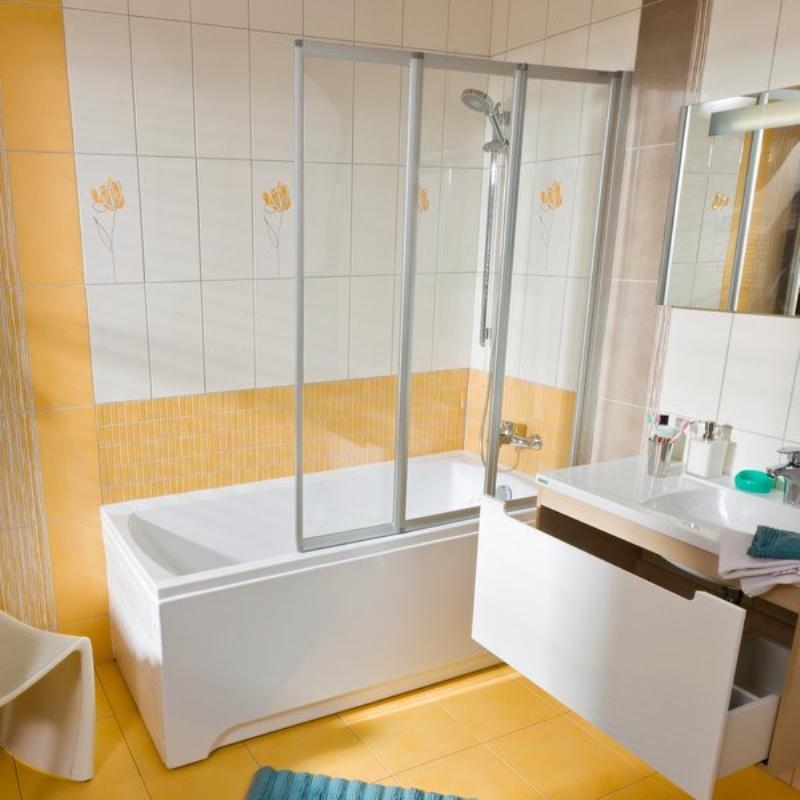 Skrin boleh didapati untuk pelbagai saiz tab mandi, set yang mungkin termasuk dinding hujung.