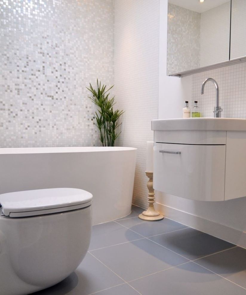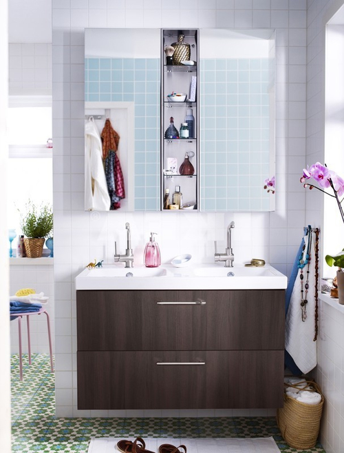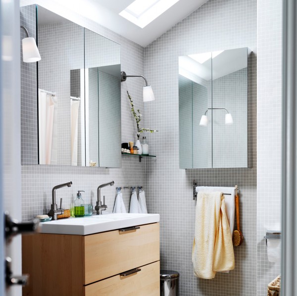Kabinet yang tergantung di bilik mandi dengan cermin secara visual meningkatkan jumlah bilik.