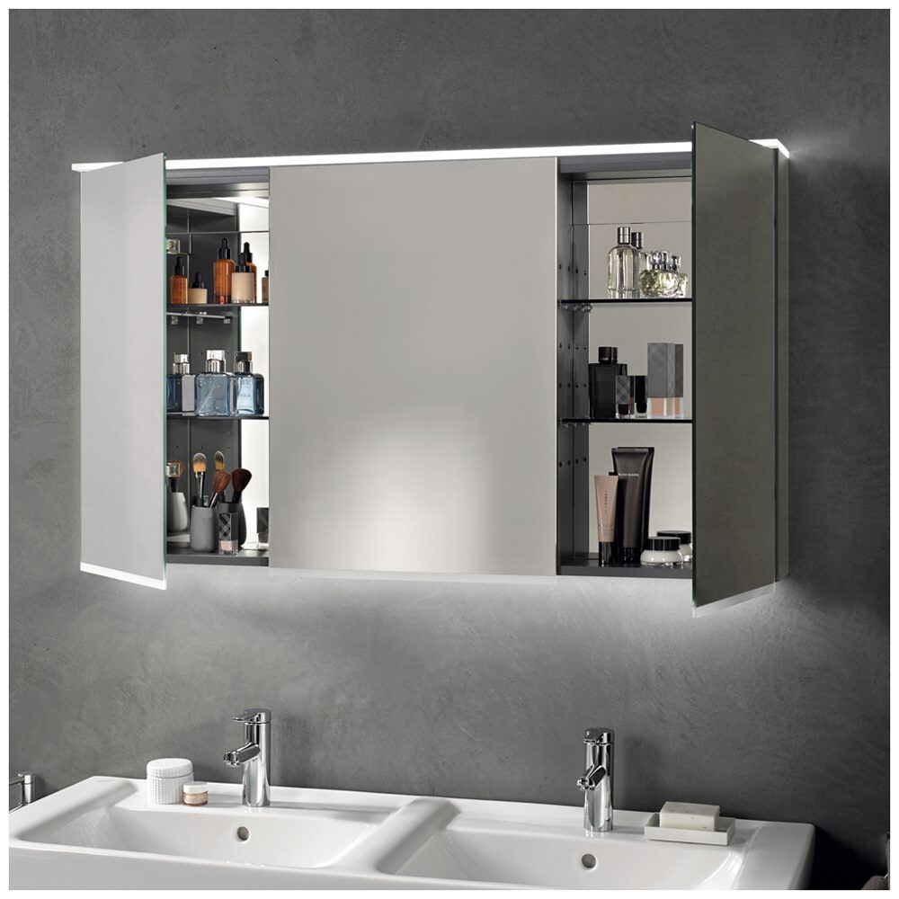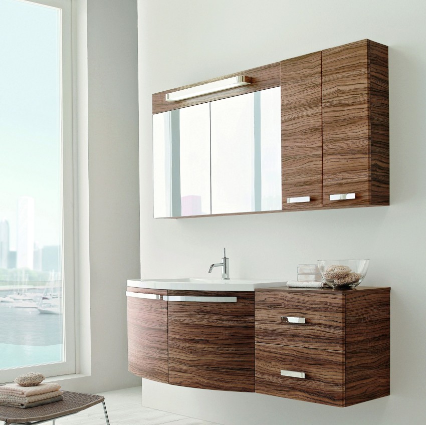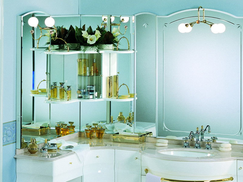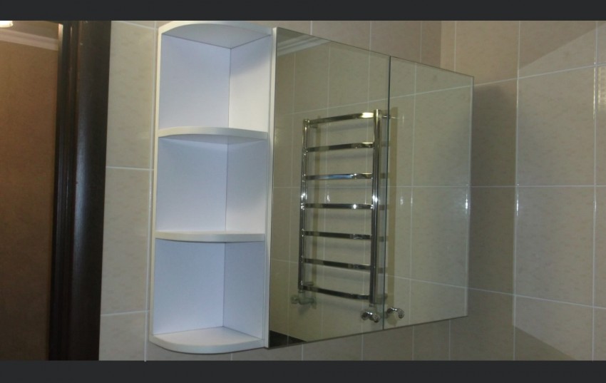 Dan hakikat bahawa fasad mempunyai permukaan yang mencerminkan membolehkan anda menjimatkan pembelian aksesori yang berasingan. Ia menjimatkan wang dan ruang (yang terakhir adalah terutama untuk bilik mandi bersaiz sederhana). Dengan cara ini, hari ini ada pilihan untuk kabinet di mana tidak satu cermin dipasang, tetapi beberapa di sudut tertentu (sejenis trellis moden) dan ia mungkin untuk memeriksa secara terperinci bukan sahaja wajah, tetapi juga gaya rambut.