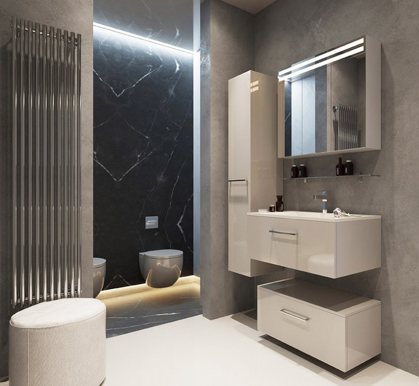 Dan agar kabinet cermin dapat mengatasi tugas utamanya sebagai cekap mungkin - untuk mencerminkan realiti - disyorkan untuk mengeluarkannya dengan pencahayaan tambahan. Ini bukan sahaja akan membuat bilik lebih berfungsi, tetapi juga membuat nota kreatif di pedalaman bilik mandi.