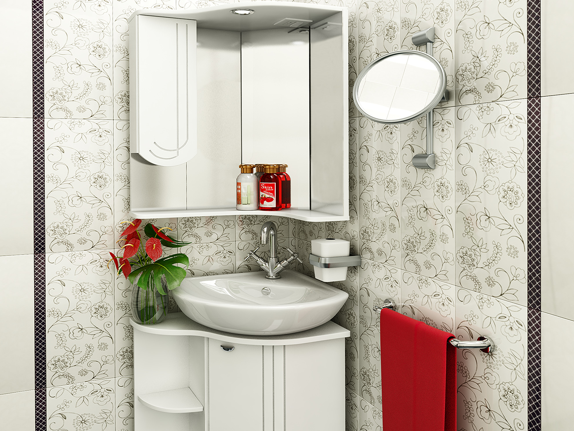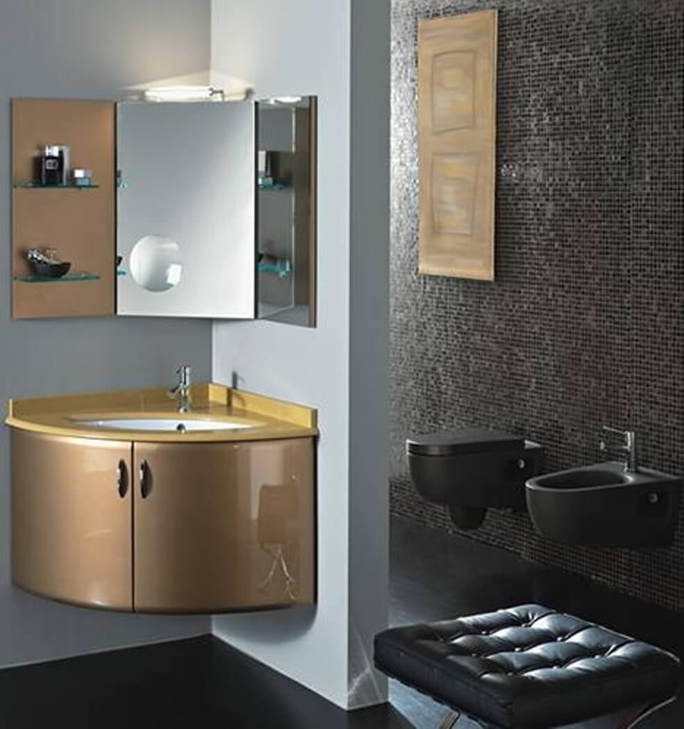 - Sudut Model sedemikian adalah mencari sebenar untuk bilik mandi kecil. Lagipun, biasanya sudut tetap bebas, dan di sini adalah mungkin untuk meletakkan unsur-unsur penting dalam pedalaman sedemikian rupa sehingga ia mudah dan dengan "kos" minimum ruang. Sebagai peraturan, kabinet hanya kelihatan sangat kecil dalam penampilan, dalam praktiknya, dalam "usus" mereka menyimpan semua keperluan dan lebih.