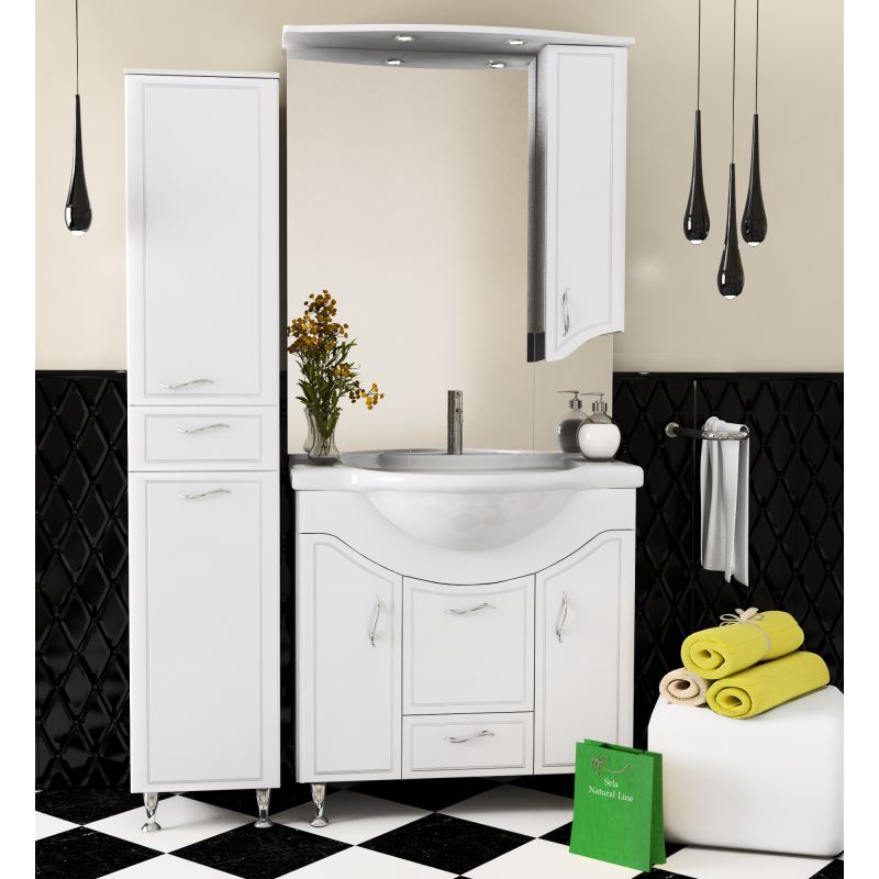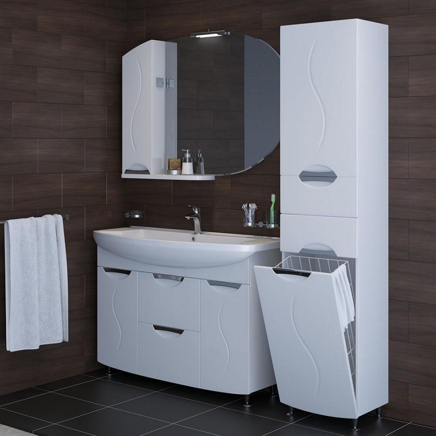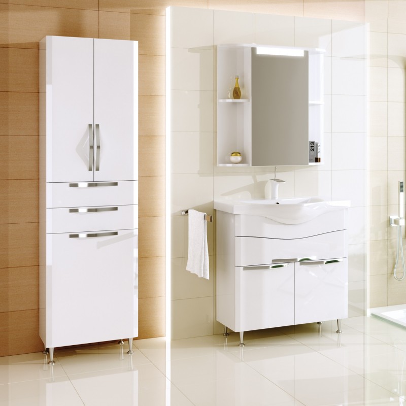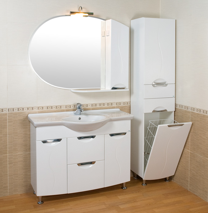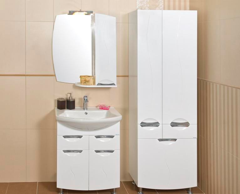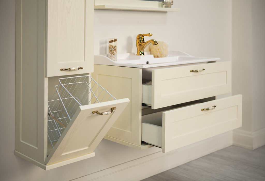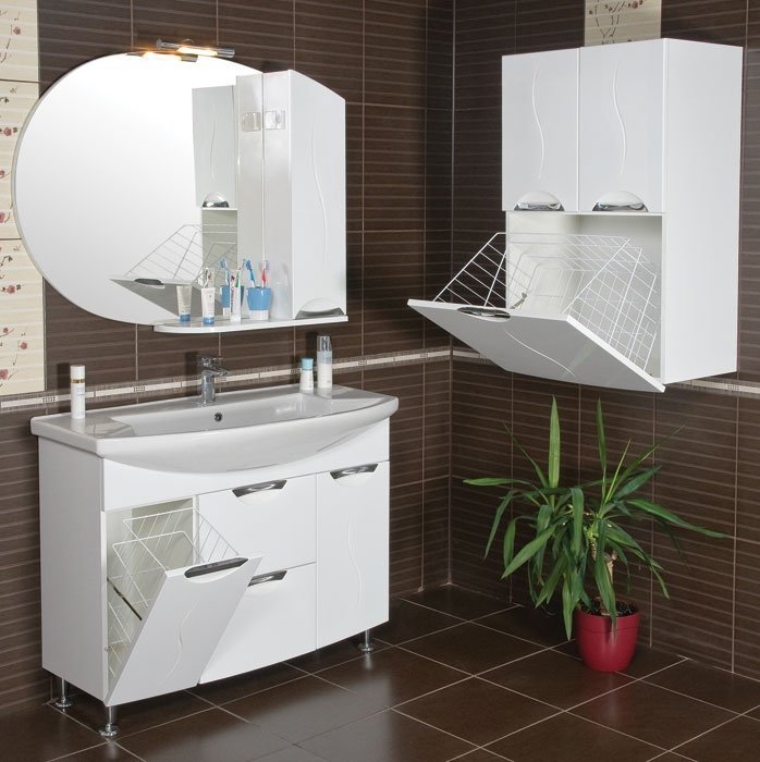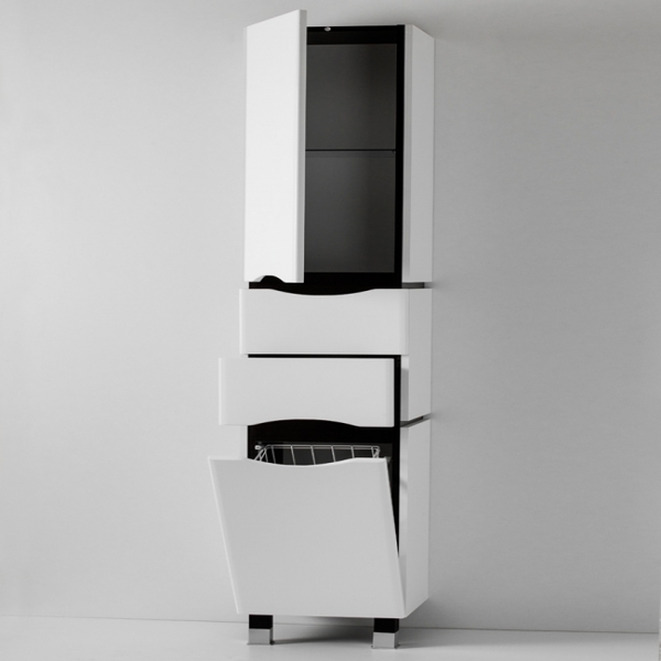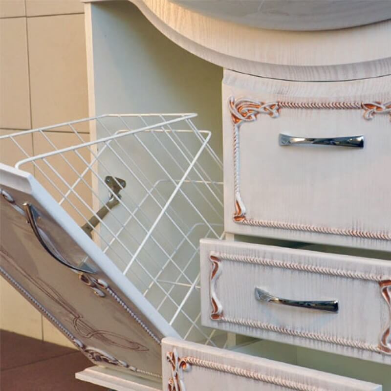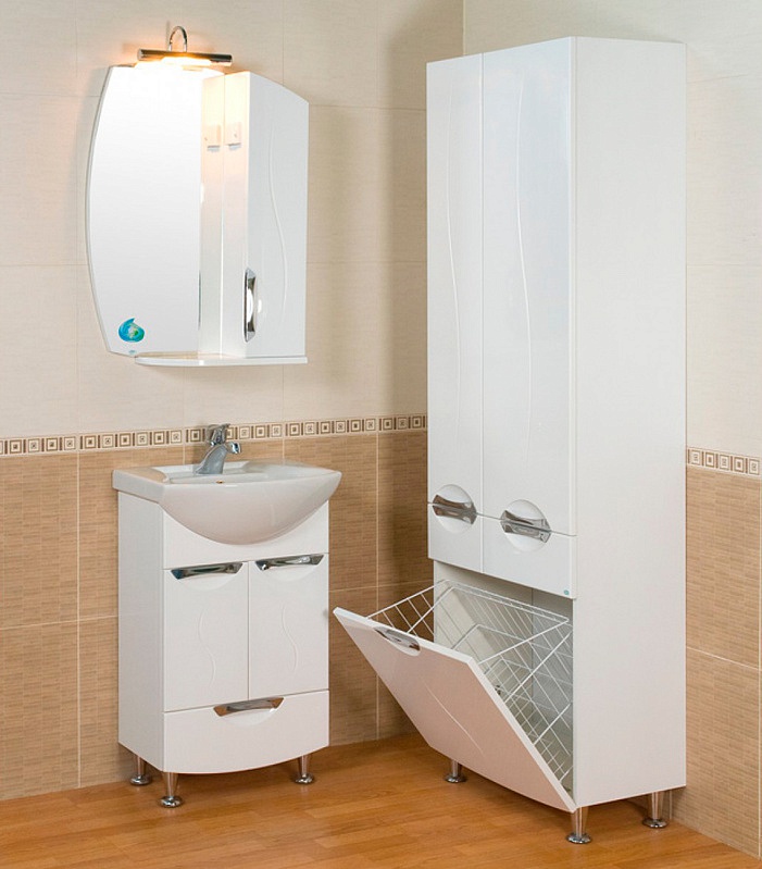 - Klasik Kabinet seperti itu dipasang di bilik mandi yang besar - perabot ini menganjurkan ruang dengan betul, dan pesanan akan memerintah di dalam bilik. Ia mudah dan berbilang fungsi - terdapat keranjang cucian terbina dalam, anda akan meletakkan semua yang anda perlukan di rak-rak banyak. Sekiranya anda mahu, letakkan cermin di atasnya, jadi lebih mudah untuk meletakkan diri anda dalam urutan, melakukan solek.