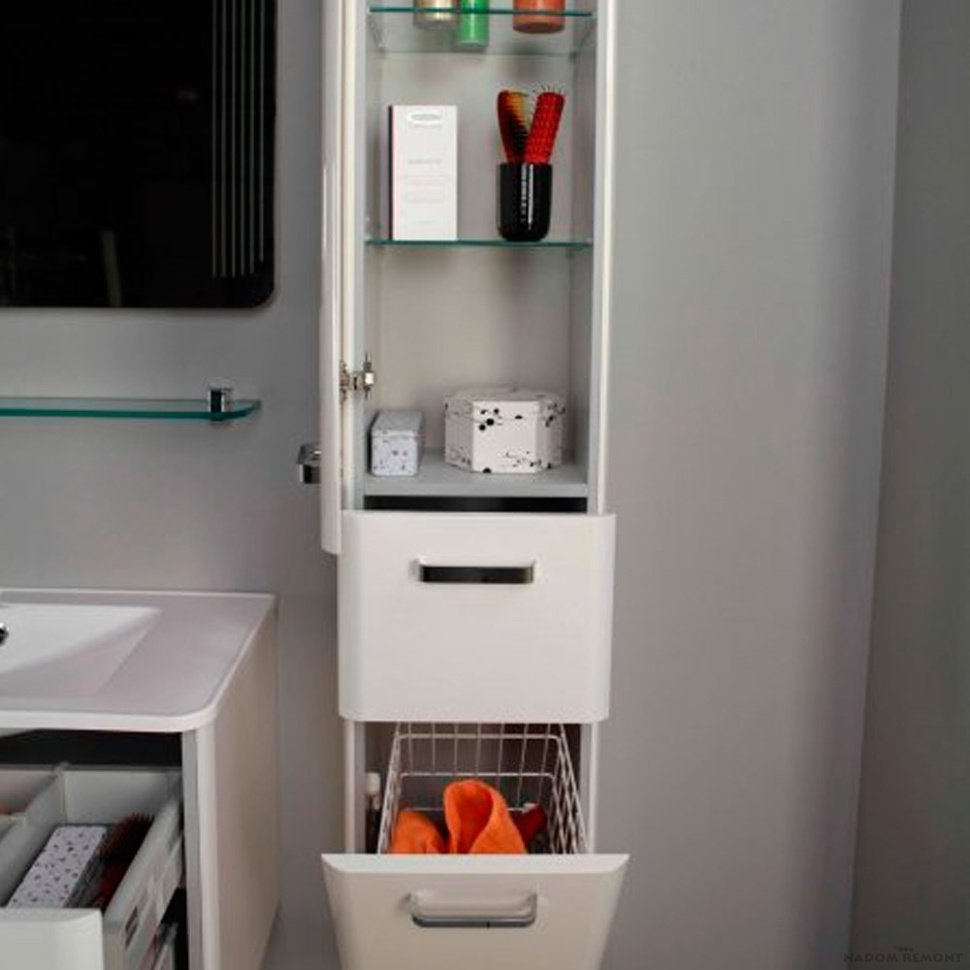 - Kes pensil. Sekiranya terdapat kawasan yang sempit dan tidak terisi, perabot ini akan kos efektif mengisi ruang ini. Jika anda tidak berpuas hati dengan perabot siap di bilik mandi di kedai, anda boleh memesannya, dan tukang-tukang akan membuat kabinet serbaguna universal jika dikehendaki. Jika meter bilik tidak membenarkan anda mempunyai kabinet dengan pintu, terdapat banyak struktur terbuka yang dilengkapi dengan bakul dan rak dobi.