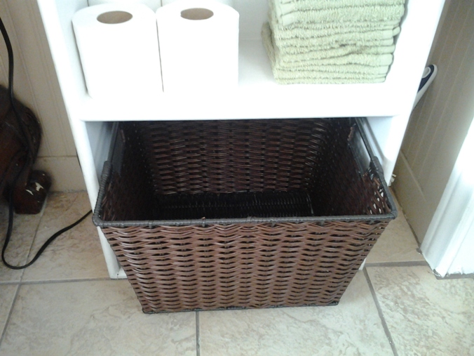 - Kasut almari pakaian di lantai bilik mandi dengan bakul untuk linen kotor