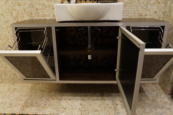 Dalam pembuatan fasad untuk kabinet, mandi dengan keranjang cucian menggunakan jenis bahan yang sama untuk kes-kes.